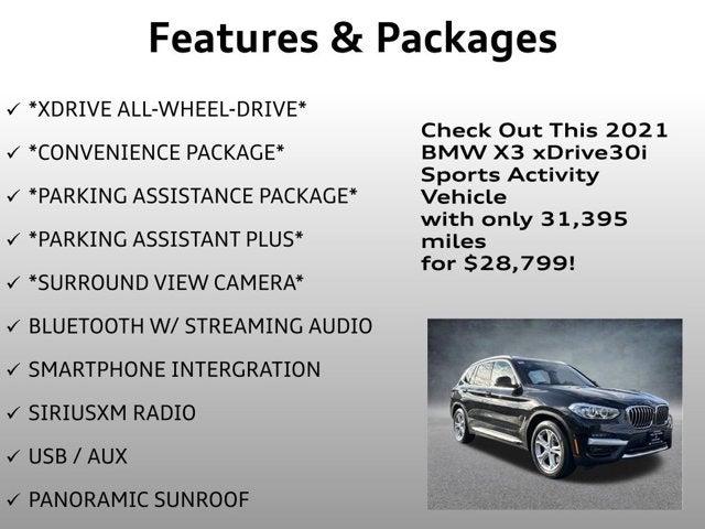 Every vehicle comes with a thorough inspection report, Carfax history report and market evaluation. Many of our vehicles sell within the first 14 days so we highly encourage you to call to check availability. 2021 BMW X3 Black Sapphire Metallic xDrive30i AWD 2.0L I4 TwinPower Turbo 8-Speed Automatic Sport.
