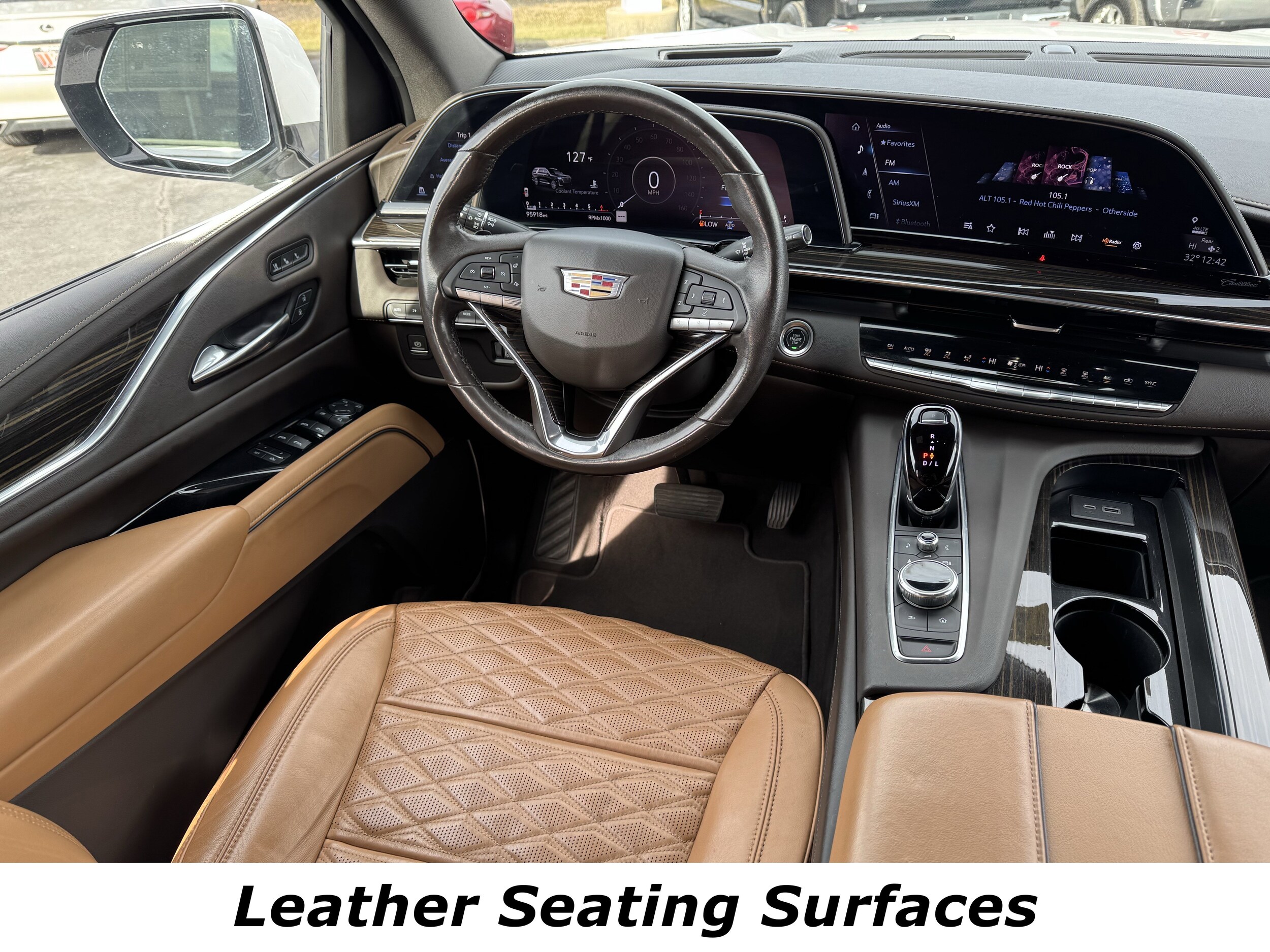Recent Arrival! 4WD, Brandy With Very Dark Atmosphere Accents Leather. Awards: ALG Residual Value Preferred Equipment Group 1SB, 4WD, Brandy With Very Dark Atmosphere Accents Leather, 16.9 Diagonal OLED Infotainment Screen, 19 Speakers, 2-Presets Memory For Driver Seat Adjuster, 3rd row seats: split-bench, 4-Way Power Driver Lumbar Seat Adjuster, 4-Way Power Front Passenger Lumbar Seat Adjuster, 8-Way Power Driver Seat Adjuster, 8-Way Power Front Passenger Seat Adjuster, ABS brakes, Air Conditioning, Alloy wheels, AM/FM radio: SiriusXM with 360L, Apple CarPlay/Android Auto, Audio memory, Auto High-beam Headlights, Auto tilt-away steering wheel, Auto-dimming door mirrors, Auto-dimming Rear-View mirror, Automatic temperature control, Brake assist, Bumpers: body-color, Compass, Delay-off headlights, Driver door bin, Driver vanity mirror, Dual front impact airbags, Dual front side impact airbags, Electronic Stability Control, Emergency communication system: OnStar and Cadillac connected services capable, Four wheel independent suspension, Front anti-roll bar, Front Bucket Seats, Front Center Armrest w/Storage, Front dual zone A/C, Front reading lights, Fully automatic headlights, Garage door transmitter, HD Radio, Heads-Up Display, Heated & Ventilated Driver & Front Passenger Seats, Heated door mirrors, Heated Driver & Front Passenger Seats, Heated front seats, Heated rear seats, Heated steering wheel, Illuminated entry, Leather Seating Surfaces w/Mini-Chevron Perf Inserts, Leather steering wheel, Low tire pressure warning, Memory seat, Navigation System, Not Equipped w/Automatic Stop/Start, Not Equipped w/Steering Column Lock, Occupant sensing airbag, Outside temperature display, Overhead airbag, Overhead console, Panic alarm, Passenger door bin, Passenger vanity mirror, Power door mirrors, Power driver seat, Power Liftgate, Power moonroof, Power passenger seat, Power steering, Power windows, Premium Smooth Ride Suspension, Radio data system, Radio: AM/FM/SiriusXM w/Navigation, Rain sensing wipers, Rear air conditioning, Rear anti-roll bar, Rear reading lights, Rear window defroster, Rear window wiper, Remote keyless entry, Roof rack: rails only, Security system, SiriusXM w/360L, Speed control, Split folding rear seat, Spoiler, Steering wheel memory, Steering wheel mounted audio controls, Tachometer.