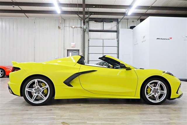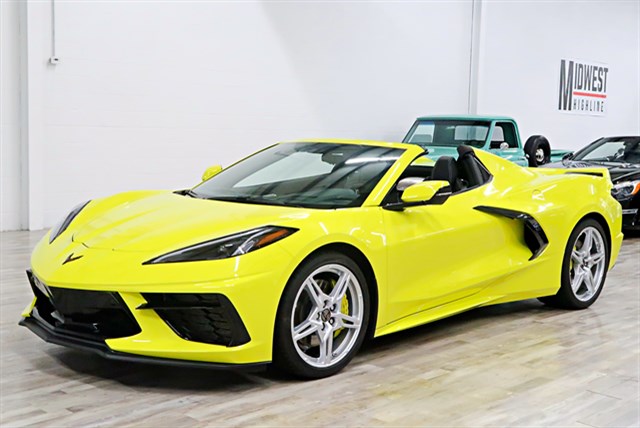 The 2021 Chevrolet Corvette 2LT Convertible features a 6.2L V8 engine and 8-speed automatic transmission. It has a clean Carfax and is a one-owner vehicle. The exterior is Accelerate Yellow Metallic with a Jet Black interior.