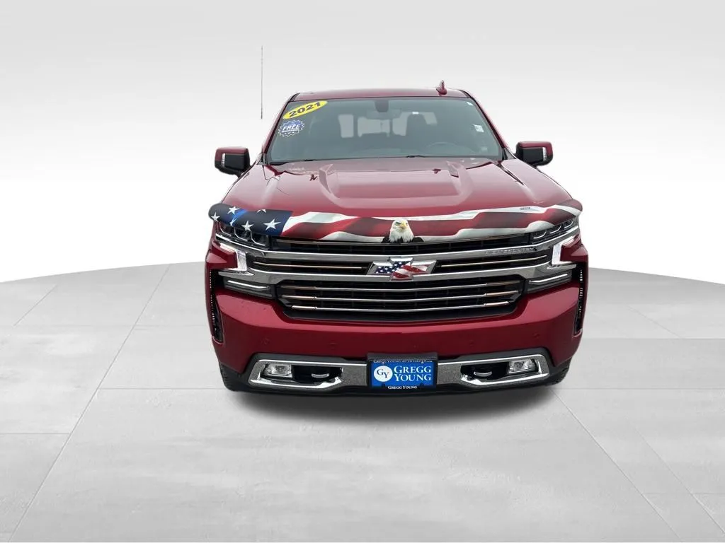 Experience the rugged capability and premium features of this 2021 Chevrolet Silverado 1500 High Country, a versatile pickup truck that combines power with comfort. With just over 45,500 miles, this used vehicle sports a striking Cherry Red Tintcoat exterior and a refined Jet Black/Umber interior, delivering a bold look and refined feel. Powered by a 5.3-liter V8 engine producing 355 horsepower and 383 lb-ft of torque, it offers a smooth 10-speed automatic transmission and standard 4WD for enhanced traction on any terrain. This Silverado is equipped with modern tech amenities like Apple CarPlay, Bluetooth, and satellite radio, ensuring connectivity on every drive. The interior features heated and rear heated seats, memory seats, keyless entry, push start, and a premium audio system, all designed to maximize comfort and convenience. Navigation and a Wi-Fi hotspot keep you connected, while wireless charging simplifies your daily routine. Whether hauling cargo or navigating city streets, this Silverado blends capability with luxury in a stylish package.