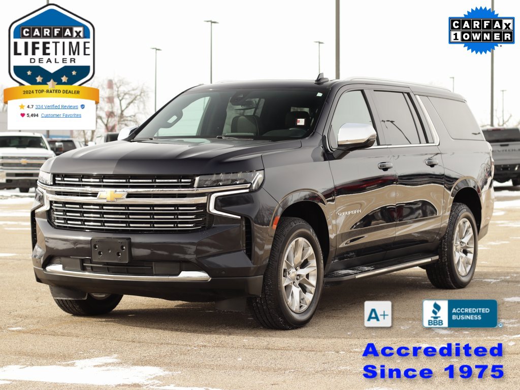 One Owner - We Sold New - Very well maintained!! The 2021 Chevrolet Suburban Premier is an ideal choice for families and drivers who want a full-size SUV that combines spacious comfort, refined luxury, and serious capability. With room for up to nine passengers and abundant cargo space, the Suburban makes long trips, carpooling, and everyday errands effortless. The Premier trim adds premium features like advanced safety tech, a powerful V8 engine, heated and ventilated leather seating, and a user-friendly infotainment system with Apple CarPlay/Android Auto to keep everyone connected and comfortable. Its smooth ride, confident handling, and upscale interior make it feel more like a premium SUV than a workhorse, while its towing strength ensures you can bring trailers, boats, or toys along for any adventure. If you’re seeking a well-equipped, dependable SUV that excels in comfort, technology, and utility, the 2021 Suburban Premier delivers exceptional value and capability for modern lifestyles. 50th Anniversary Sale!!! Come in and find out why we are the largest Chevrolet dealer in Peoria and the #1 Chevrolet dealer in Central Illinois!! Your Family owned local Chevy store for 50 Years!