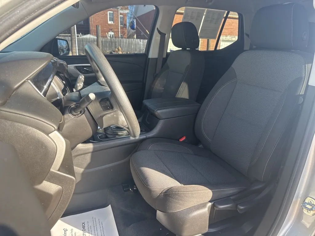 The 2021 Chevrolet Traverse LS stands out as a versatile and spacious SUV, perfect for families or those requiring ample cargo capacity. With its sleek Silver Ice Metallic exterior and Jet Black interior, this used vehicle offers a refined look combined with practical features. Powered by a 3.6-liter V6 engine delivering 310 horsepower and 266 lb-ft of torque, it pairs with a smooth 9-speed automatic transmission and all-wheel drive, ensuring confident handling in various driving conditions. This SUV comfortably seats eight with a third-row seat, making it ideal for road trips and daily commutes alike. Its fuel economy of 17 mpg city and 25 mpg highway strikes a good balance between power and efficiency. Inside, modern connectivity features like Apple CarPlay, Bluetooth, and a WiFi hotspot keep passengers connected, while the backup camera, keyless entry, push start, and rear A/C enhance convenience. The vehicle also boasts xenon headlights for improved visibility and a user-friendly infotainment system with a 7-inch touchscreen. Designed to meet safety and security needs, the 2021 Chevrolet Traverse LS includes a rear seat reminder to alert drivers of passengers, front center airbags for added protection, and four-wheel anti-lock brakes for confident stopping. Anti-lockout power door locks and auto-locking features help secure the vehicle, while a programmable safety key provides additional control. An electronic parking brake with auto-off function simplifies parking maneuvers, making this SUV a reliable choice for daily use and longer trips. These features combine to offer peace of mind and enhanced safety for all occupants.