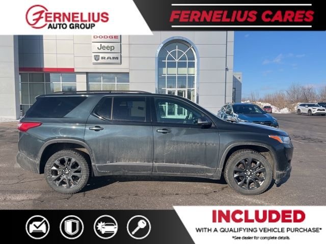 Fernelius is pleased to offer this 2021 Chevrolet Traverse RS in Graphite Metallic, beautifully equipped with Floor Liner Package (LPO) (1st & 2nd Row All-Weather Floor Liner (LPO), 3rd Row All-Weather Floor Liner (LPO), and Integrated Cargo Liner (LPO)), Preferred Equipment Group 2LT (Gloss Black Emblem Kit (LPO)), Trailering Equipment (Heavy-Duty Cooling System, Hitch Guidance w/Hitch View, and Trailering Assist Guidelines), AWD, 10 Speakers, 3.49 Axle Ratio, 3rd row seats: split-bench, 4-Wheel Disc Brakes, 7-Passenger Seating (2-2-3 Seating Configuration), ABS brakes, Air Conditioning, Alloy wheels, AM/FM radio: SiriusXM with 360L, Apple CarPlay/Android Auto, Auto High-beam Headlights, Auto-dimming Rear-View mirror, Automatic temperature control, Bose Premium 10-Speaker Audio System Feature, Brake assist, Bumpers: body-color, Compass, Delay-off headlights, Driver door bin, Driver vanity mirror, Dual front impact airbags, Dual front side impact airbags, Electronic Stability Control, Emergency communication system: OnStar and Chevrolet connected services capable, Four wheel independent suspension, Front anti-roll bar, Front Bucket Seats, Front Center Armrest, Front dual zone A/C, Front fog lights, Front reading lights, Fully automatic headlights, Garage door transmitter, Heated door mirrors, Heated front seats, Heated steering wheel, High-Intensity Discharge Headlights, Illuminated entry, Lane Departure Warning System, Leather steering wheel, Leather-Appointed Seat Trim, Low tire pressure warning, Navigation System, Occupant sensing airbag, Outside temperature display, Overhead airbag, Overhead console, Panic alarm, Passenger door bin, Passenger vanity mirror, Power door mirrors, Power driver seat, Power Liftgate, Power passenger seat, Power steering, Power windows, Premium audio system: Chevrolet MyLink, Radio data system, Radio: Chevrolet Infotainment 3 Premium System, Rear air conditioning, Rear anti-roll bar, Rear reading lights, Rear window defroster, Rear window wiper, Remote keyless entry, Roof rack: rails only, Security system, SiriusXM w/360L, Speed control, Speed-sensing steering, Spoiler, Steering wheel mounted audio controls, Tachometer, Telescoping steering wheel, Tilt steering wheel, Traction control, Trip computer, Turn signal indicator mirrors, Variably intermittent wipers, Voltmeter, and Wheels: 20" Dark Android Painted Aluminum. Concierge delivery available for any location in the US. Fernelius Toyota, Chrysler, Dodge, Jeep, Ram in Cheboygan, Michigan is a family owned and operated business for over 25 years. Visit us 24/7 at fernelius.com or give us a call at 231-627-5673. We Have a True Commitment to Exceeding Your Expectations Before, During and After Your Vehicle Purchase!