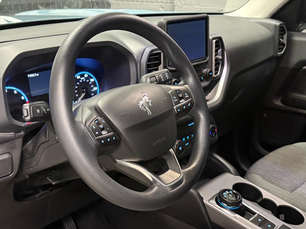 This vehicle is a 2021 Ford Bronco Sport Big Bend SUV all wheel drive with a 1.5 liter EcoBoost Turbo I3 181hp 190 lb-ft engine, and turbocharged. It has driven 71,028 miles and has a fuel economy of 25 mpg in the city and 28 mpg on the highway. It has a crash test rating of 5 out of 5 stars and features such as blind spot sensor, hill start assist, and on demand four wheel drive. This automobile is sure to turn heads with its sleek design and modern features.