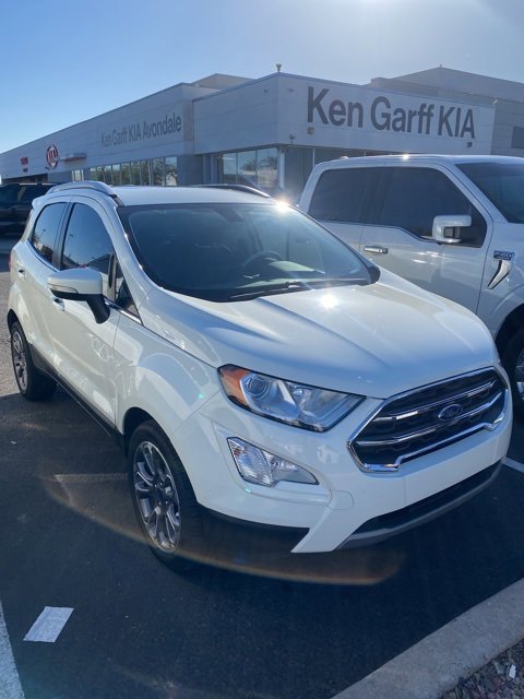 Diamond White 2021 Ford EcoSport Titanium FWD 6-Speed Automatic EcoBoost 1.0L I3 GTDi DOHC Turbocharged VCT, 10 Speakers, 3.44 Axle Ratio, 4-Wheel Disc Brakes, ABS brakes, ActiveX Seating Material Heated Front Bucket Seats, Air Conditioning, Alloy wheels, AM/FM radio: SiriusXM, Auto-dimming Rear-View mirror, Automatic temperature control, Brake assist, Bumpers: body-color, Compass, Delay-off headlights, Driver door bin, Driver vanity mirror, Dual front impact airbags, Dual front side impact airbags, Electronic Stability Control, Emergency communication system: SYNC 3 911 Assist, Equipment Group 400A, Exterior Parking Camera Rear, Front anti-roll bar, Front Bucket Seats, Front Center Armrest, Front fog lights, Front reading lights, Front wheel independent suspension, Fully automatic headlights, Heated door mirrors, Heated front seats, Heated steering wheel, Illuminated entry, Knee airbag, Leather Shift Knob, Leather steering wheel, Low tire pressure warning, Navigation System, Occupant sensing airbag, Outside temperature display, Overhead airbag, Overhead console, Panic alarm, Passenger door bin, Passenger vanity mirror, Power door mirrors, Power driver seat, Power moonroof, Power steering, Power windows, Radio data system, Radio: AM/FM/MP3 Stereo, Rain sensing wipers, Rear Parking Sensors, Rear seat center armrest, Rear side impact airbag, Rear window defroster, Rear window wiper, Remote keyless entry, Roof rack: rails only, Security system, SiriusXM Radio, SiriusXM Traffic & Travel Link, Speed control, Speed-sensing steering, Split folding rear seat, Steering wheel mounted audio controls, SYNC 3 Communications & Entertainment System, Tachometer, Telescoping steering wheel, Tilt steering wheel, Traction control, Trip computer, Turn signal indicator mirrors, Variably intermittent wipers, Wheels: 17 Premium Dark Stainless-Painted. Recent Arrival! Odometer is 11755 miles below market average! 27/29 City/Highway MPG.