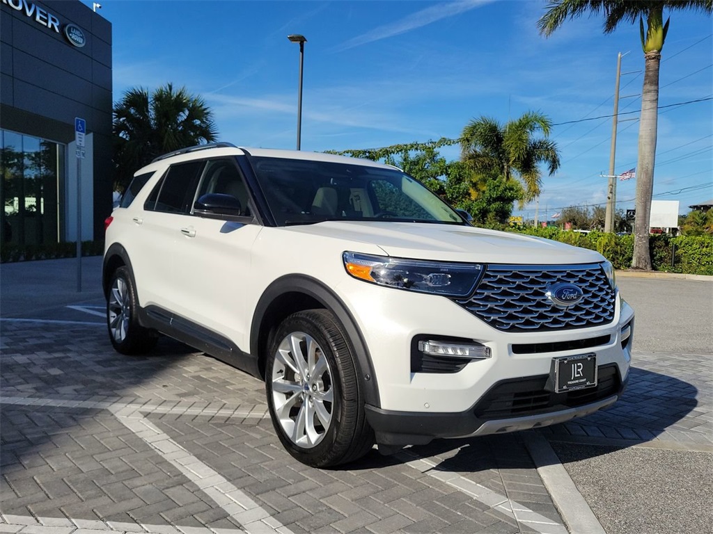 Recent Arrival! Carfax One-Owner. This 2021 Star White Metallic Tri-Coat Ford Explorer Platinum 4WD is well equipped and includes these features and benefits: 10-Speed Automatic 3.0L EcoBoost V6 Odometer is 35325 miles below market average! 10.1" LCD Capacitive Portrait Touchscreen, 2 Additional Speakers, 3rd row seats: bench, Equipment Group 601A, Leather Htd/Ventilated Sport Captain's Chairs, Navigation System, Power Liftgate, Premium Technology Package, Twin Panel Moonroof, Wheels: 21" Bright Machined-Face Aluminum. Discover The Difference at Jaguar Land Rover Treasure Coast!