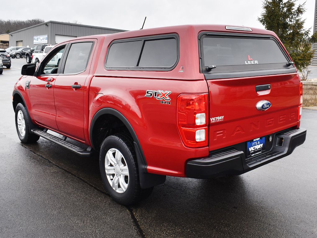 This 2021 Ford Ranger SuperCrew Cab is a one-owner vehicle that has been bought and serviced here since new. It features a STX Appearance Package, XL Equipment Group, 2.3L EcoBoost engine, 4WD, and a Red color-matched topper. The interior is Ebony, and it comes with a keyless entry keypad, 17" alloy wheels, and a range of convenience features.