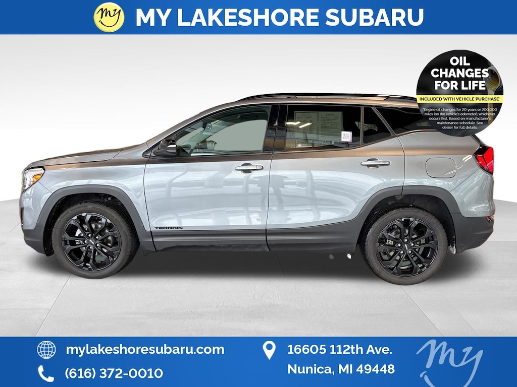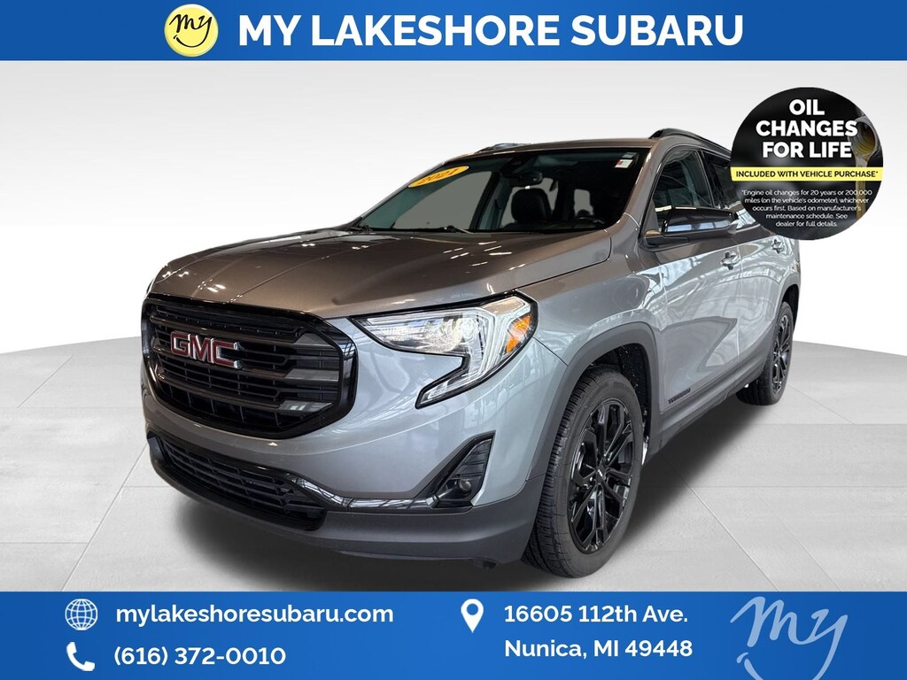 Terrain SLT, AWD, Satin Steel Metallic, All wheel drive, Apple CarPlay & Android Auto, heated steering wheel, lane departure warning, leather heated power seats, local trade, oil changes for life, Black GMC Center Caps w/Black GMC Lettering, Black Mirror Caps, Darkened Front Grille, Elevation Edition, Preferred Equipment Group 4SA, Roof-Mounted Luggage Rack Black Side Rails, Wheels: 19" x 7.5" Gloss Black Painted Aluminum. Satin Steel Metallic 2021 GMC Terrain SLT AWD 9-Speed Automatic 1.5L DOHC. My Lakeshore Subaru is your #1 choice in Michigan to get the best price on used vehicles and best value for your trade. The My Lakeshore Subaru team is ready to provide you with a world-class experience, ensuring that you find the perfect vehicle that fits all your needs. Every vehicle has been through a full safety inspection completed by certified technicians and fully detailed. Recent arrival! 25/28 City/Highway MPG.