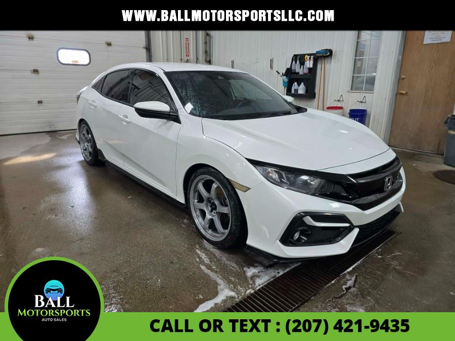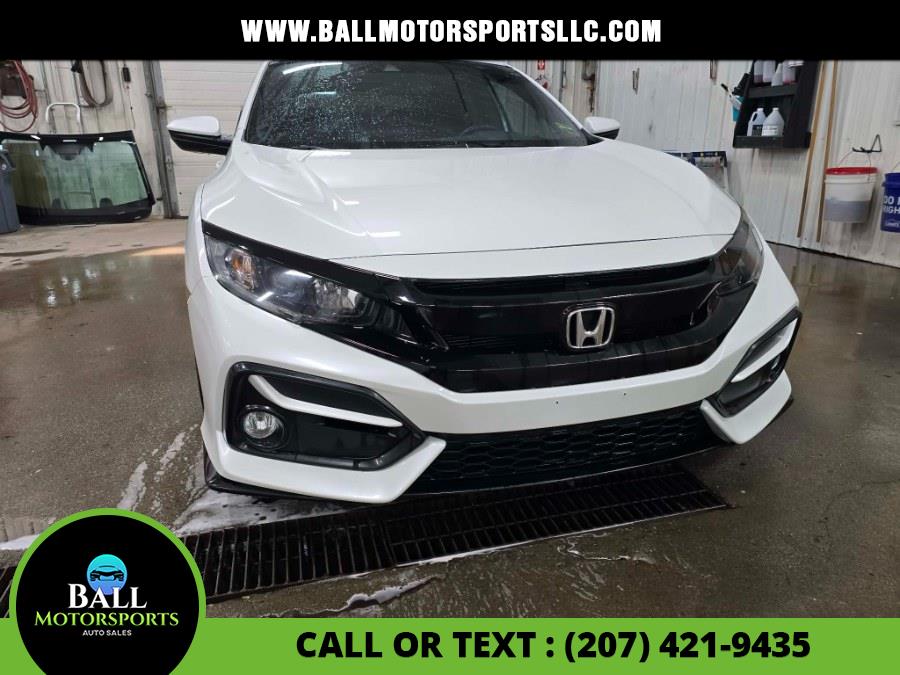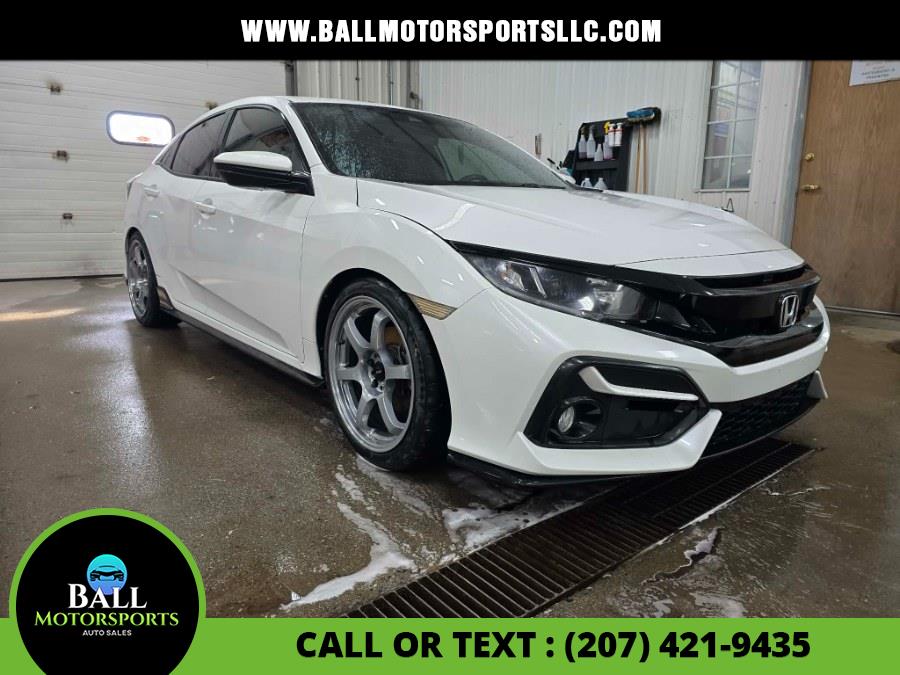 This 2021 Honda Civic Hatchback Sport CVT is available for sale in Brewer, Maine. It features a 1.5L 4-cylinder turbocharged engine, a CVT transmission, and a Platinum White Pearl exterior with a Black interior. The vehicle is described as "very clean" and offers a comfortable ride with modern features. Please confirm the accuracy of the specifications provided above with the dealer's representative.