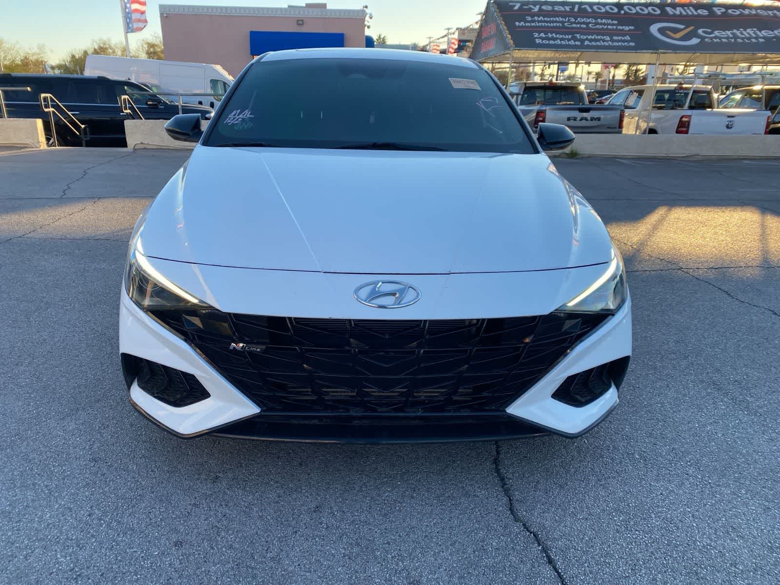 Calling all enthusiasts, our Accident Free 2021 Hyundai Elantra N Line Sedan in Ceramic White is an athletic sport compact that delivers the thrills you crave! Motivated by a TurboCharged 1.6 Liter 4 Cylinder generating 201hp tethered to a 7 Speed Dual-clutch Automatic transmission for quick shifts that keep you on the move. This Front Wheel Drive sedan also shows off performance-tuned steering and suspension systems plus upsized front brakes for fantastic handling, and it scores nearly 36mpg on the highway. Our Elantra gets a more aggressive look, too, with exclusive N Line bumpers and a dark chrome grille to go with LED lighting, a power sunroof, a hands-free trunk, alloy wheels, and a chrome-tipped dual exhaust. Our N Line cockpit caters to your need for speed with leather/cloth heated front sport seats, a heated leather steering wheel, dual-zone automatic climate control, and alloy pedals. For fast connections, you're treated to an 8-inch touchscreen, wireless Android Auto/Apple CarPlay, Bluetooth, wireless charging, and a six-speaker sound system. Command the road with confidence, know Hyundai supplies intelligent safety measures such as lane-keeping assistance, a rearview camera, blind-spot detection, a safe-exit warning, a driver attention monitor, automatic braking, and more. You're at the center of attention in our sleek Elantra N Line! Save this Page and Call for Availability. We Know You Will Enjoy Your Lithia Sahara Chrysler Dodge Ram L0517 Test Drive Towards Ownership! Must finance with Chrysler Capital for all discounts to be applied.