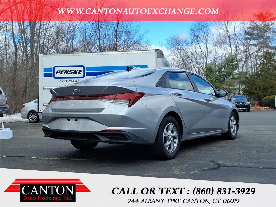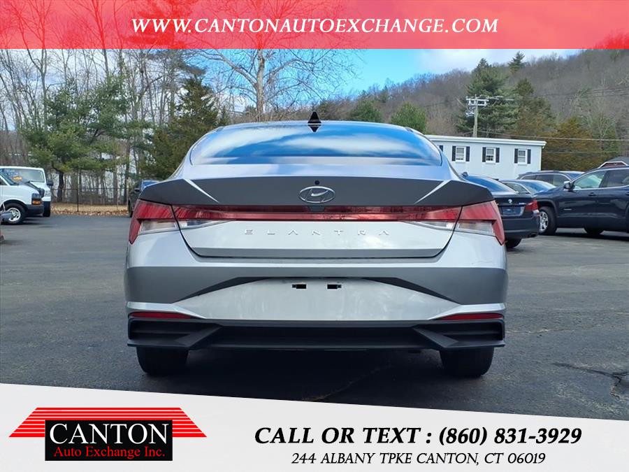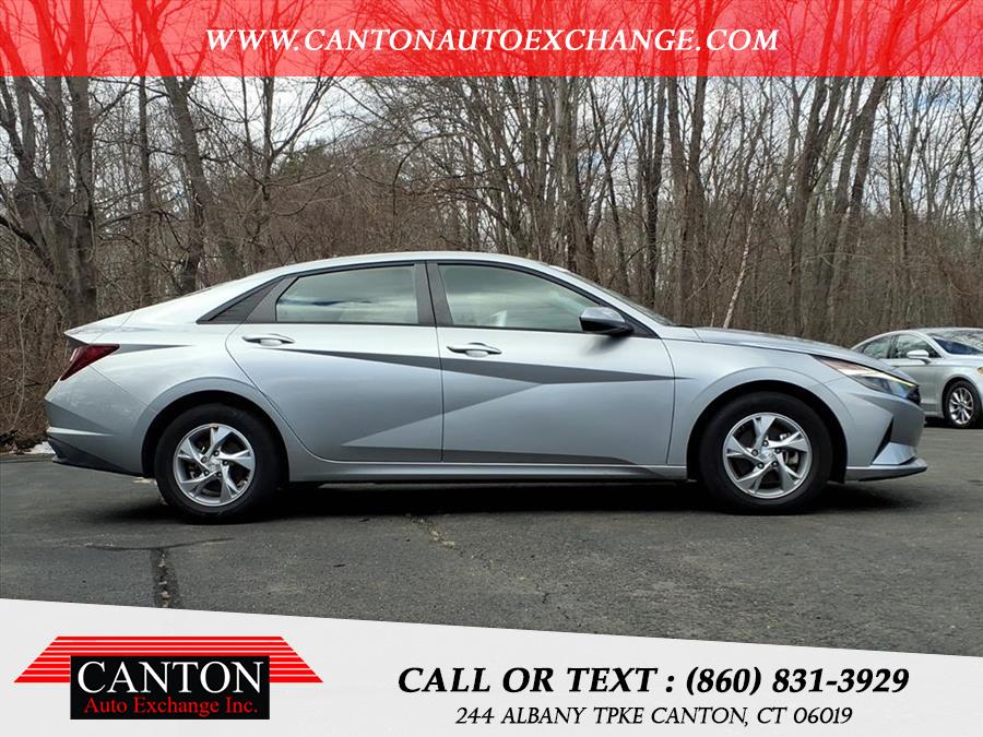 This 2021 Hyundai Elantra SE is available for sale in Canton, Connecticut. It features a 2.0L 4-cylinder engine, front wheel drive, and a Shimmering Silver Pearl exterior with a Black interior. The vehicle is in stock and available at Canton Auto Exchange.