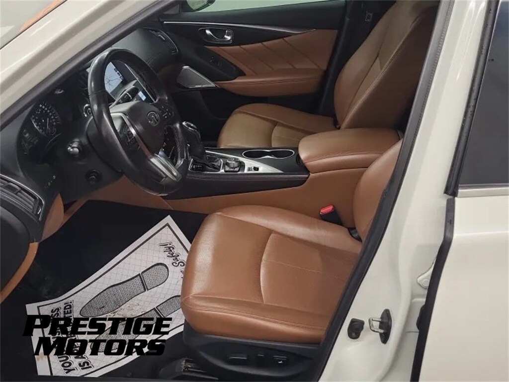 Q50 3.0t SENSORY, 4D Sedan, AWD, 16 Speakers, 4-Wheel Disc Brakes, ABS brakes, Air Conditioning, Alloy wheels, AM/FM radio: SiriusXM, Apple CarPlay/Android Auto, Auto High-beam Headlights, Auto tilt-away steering wheel, Auto-dimming door mirrors, Auto-dimming Rear-View mirror, Automatic temperature control, Blind Spot Warning, Brake assist, Bumpers: body-color, CD player, Compass, Delay-off headlights, Driver door bin, Driver vanity mirror, Dual front impact airbags, Dual front side impact airbags, Electronic Stability Control, Emergency communication system: INFINITI Connection, Four wheel independent suspension, Front anti-roll bar, Front Bucket Seats, Front Center Armrest, Front dual zone A/C, Front fog lights, Front reading lights, Fully automatic headlights, Garage door transmitter: HomeLink, Genuine wood dashboard insert, Genuine wood door panel insert, Heated door mirrors, Heated front seats, Heated Front Sport Seats, Heated steering wheel, Illuminated entry, Leather Seating Surfaces, Leather Shift Knob, Leather steering wheel, Low tire pressure warning, Memory seat, Navigation system: INFINITI InTouch Navigation, Occupant sensing airbag, Outside temperature display, Overhead airbag, Overhead console, Panic alarm, Passenger door bin, Passenger vanity mirror, Power door mirrors, Power driver seat, Power moonroof, Power passenger seat, Power steering, Power windows, Radio data system, Radio: INFINITI InOne w/Navigation w/Navigation w/Navigation), Rain sensing. The Q50 is a great car.