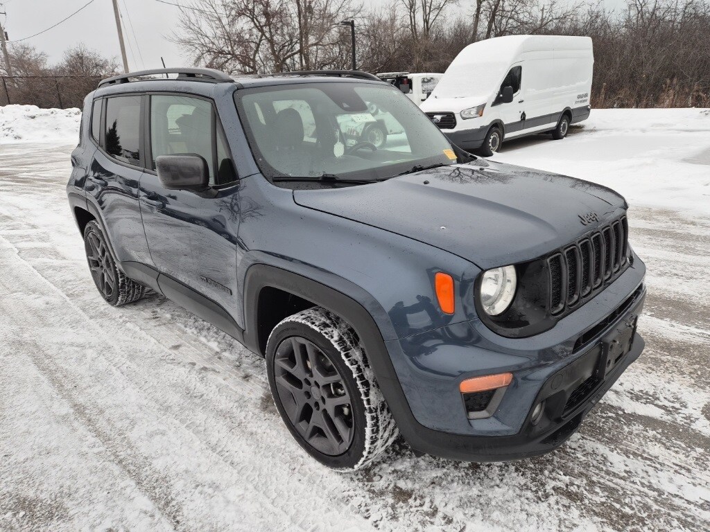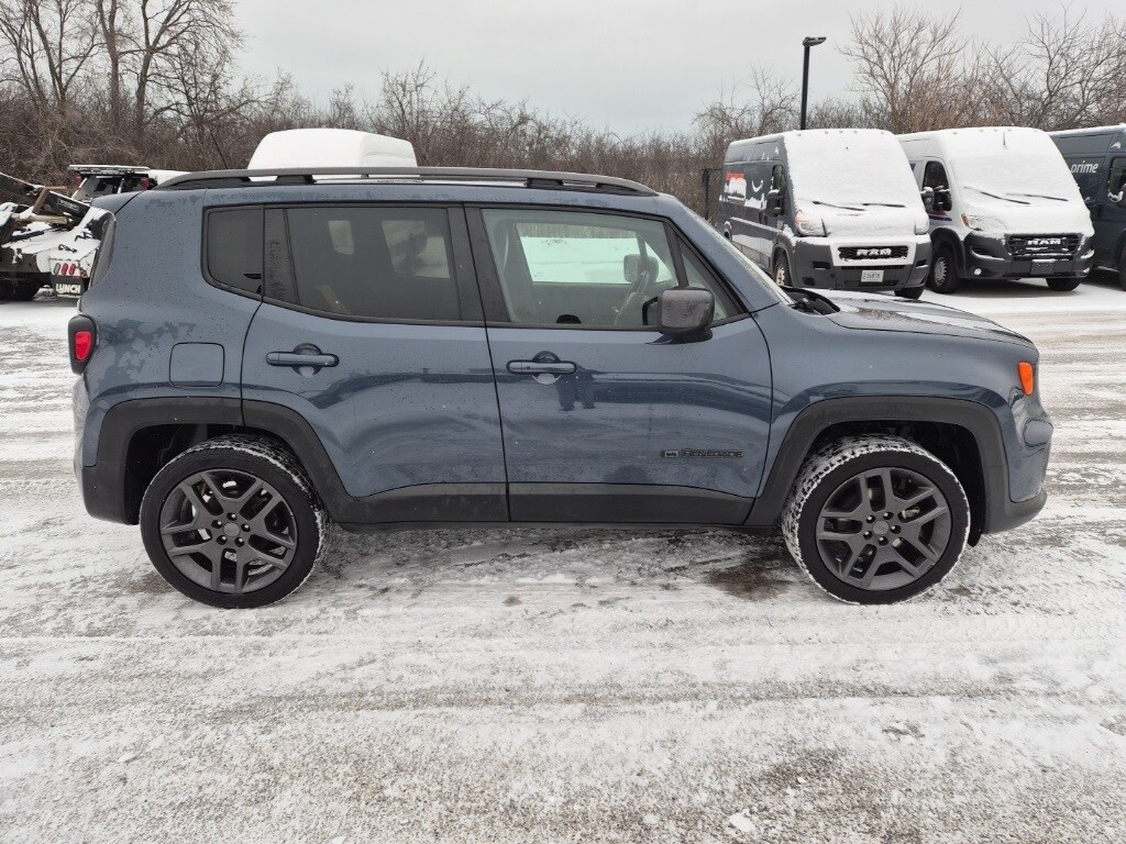 The 2021 Jeep Renegade 80th Edition 4x4 combines Jeep heritage with modern capability and everyday comfort. Finished in Slate Blue Pearl-Coat, this special edition stands out with unique 80th Anniversary accents, satin granite exterior details, roof rails, and bold alloy wheels that give it a distinctive, upscale look. Inside, the cabin features black 80th Edition premium cloth seats, anniversary badging, and refined trim throughout. The interior is designed for comfort and convenience, offering heated front seats, a heated leather-wrapped steering wheel, power-adjustable driver seating with lumbar support, and a panoramic dual-pane power sunroof that brings in natural light. Power comes from a 2.4L 4-cylinder engine paired with a 9-speed automatic transmission, delivering smooth performance and efficiency. The Selec-Terrain 4x4 system provides confident traction in a variety of driving conditions, supported by electronic stability control, hill-start assist, and all-speed traction control. Technology is centered around the Uconnect touchscreen system with built-in navigation, making it easy to stay connected and on course. Additional features include push-button start, remote start, a premium audio system, and multiple USB and power outlets for everyday convenience. Safety is well covered with advanced airbags, lane departure warning, forward collision warning, blind-spot monitoring, rear cross-path detection, and a ParkView rear backup camera, adding confidence on both city streets and highways. The 2021 Jeep Renegade 80th Edition 4x4 delivers distinctive styling, capable four-wheel drive, and a comfortable, well-equipped interior in a compact SUV that's ready for daily driving and weekend adventures.