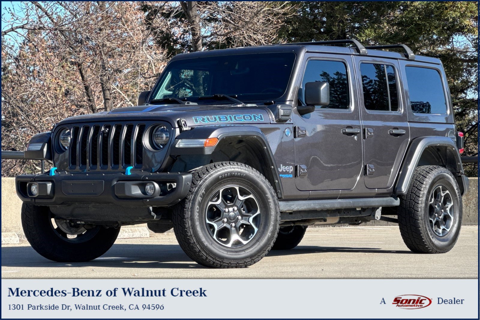 Clean CARFAX! This 2021 Jeep Wrangler 4xe Unlimited Rubicon comes equipped with backup camera, push button start, and keyless entry! It has under 103,800 miles! This '21 Wrangler 4xe Unlimited Rubicon just passed a multi-point safety inspection performed by a Factory-trained Certified Mercedes-Benz Master technician. Do not expect this vehicle to last long; hurry in for a test drive today! Mercedes-Benz of Walnut Creek Market Price Guarantee -- Our commitment to you is the price you see here is guaranteed to be at or below the current market value for this vehicle based on year, miles, equipment and availability.