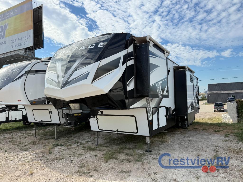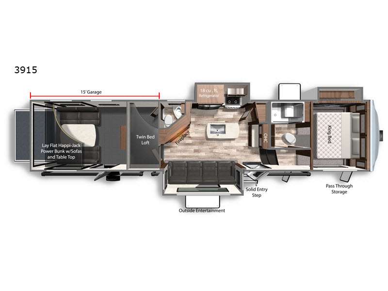 Dutchmen Voltage toy hauler 3915 highlights: Full and Half Bath Twin-Size Loft Dual Entry Happi-Jack Power Bunk Kitchen Island 15' Separate Garage There is so much convenience packed into this Voltage toy hauler! The 15' separate garage comes equipped with a half bathroom, a garage TV, the second exterior entry door, and sleeping accommodations which will provide you with an excellent guest suite. You will actually have your own master suite with a king-size bed up at the front of this unit, and everyone will benefit from the exterior entertainment center. The main kitchen/living area has two opposing slides so that you can sit back on the residential sofa with heat and massage as you take in the warmth of the fireplace, and the pendant lighting above the kitchen island is a stunning addition to the fully equipped kitchen. You will be extremely impressed by the amount of luxury found on the Dutchmen Voltage fifth wheel toy hauler! Some of the premium features that you will find on the Voltage are the Zero-Gravity ramp door that lets you access your toys with very little effort and the king-size bed which offers you extra space for sleeping comfortably. The Voltage also has industry-leading 7'-tall slides so that you can feel free to stretch your legs while inside. The ramp door patio system is certainly going to be an appealing factor because it provides you with an extra party space, and the dedicated heat ducts for the underbelly and the All-Weather Package with additional insulation will ensure that your Voltage is protected and prepared for all sorts of weather.