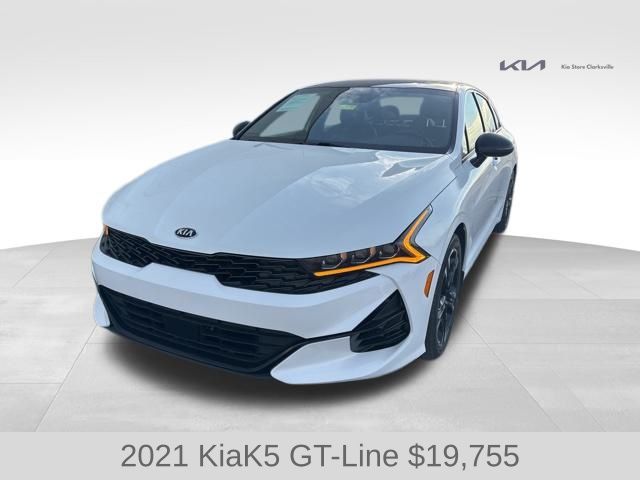 Discover the captivating 2021 Kia K5 GT-Line, a sophisticated sedan that blends style, performance, and cutting-edge technology. This stunning vehicle is the perfect fusion of dynamic driving and refined elegance, making it the ideal choice for the discerning automotive enthusiast. Boasting a striking Glacial White Pearl exterior, the K5 GT-Line commands attention with its bold, sculpted lines and sleek, aerodynamic profile. Complementing the exterior is a well-appointed interior that pampers you with features like heated front bucket seats, a panoramic sunroof, and a premium audio system with seamless Apple CarPlay and Android Auto integration. Under the hood, the K5 GT-Line is powered by a potent 1.6L I4 DGI engine, paired with an 8-speed automatic transmission and all-wheel drive for exceptional performance and confident handling. With an impressive EPA-estimated 26 city/34 highway mpg, this sedan delivers both exhilarating driving dynamics and exceptional fuel efficiency. Designed with your safety in mind, the K5 GT-Line is equipped with a comprehensive suite of advanced driver assistance technologies, including automatic high-beam headlights, forward collision-avoidance assist, and lane keep assist. These cutting-edge features work in harmony to provide you with peace of mind and a truly connected driving experience. Beyond its impressive capabilities, the K5 GT-Line also boasts a refined and sophisticated interior that caters to your every need. Sink into the plush, heated front seats and take in the panoramic views through the expansive sunroof. Enjoy the convenience of the driver's power seat, steering wheel-mounted audio controls, and dual-zone automatic climate control, all while surrounded by the rich, premium materials that elevate the cabin to new levels of luxury. Whether you're commuting through the city or embarking on a weekend getaway, the 2021 Kia K5 GT-Line is the perfect companion. Its blend of style, performance, and technology makes it a standout in the midsize sedan segment. Experience the difference for yourself and schedule a test drive today. We're confident you'll be impressed by the exceptional value and driving experience this vehicle has to offer.