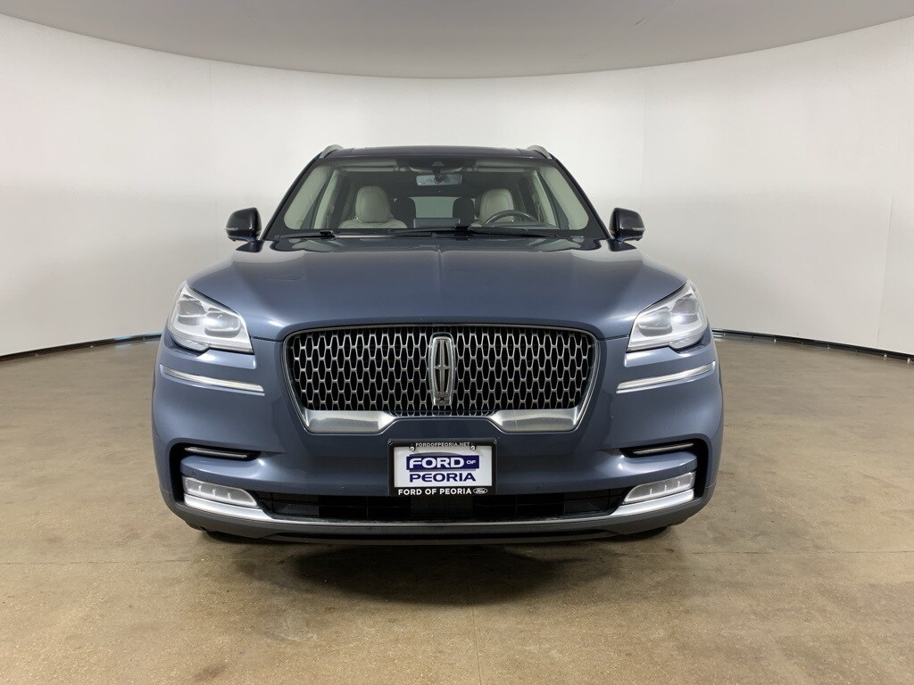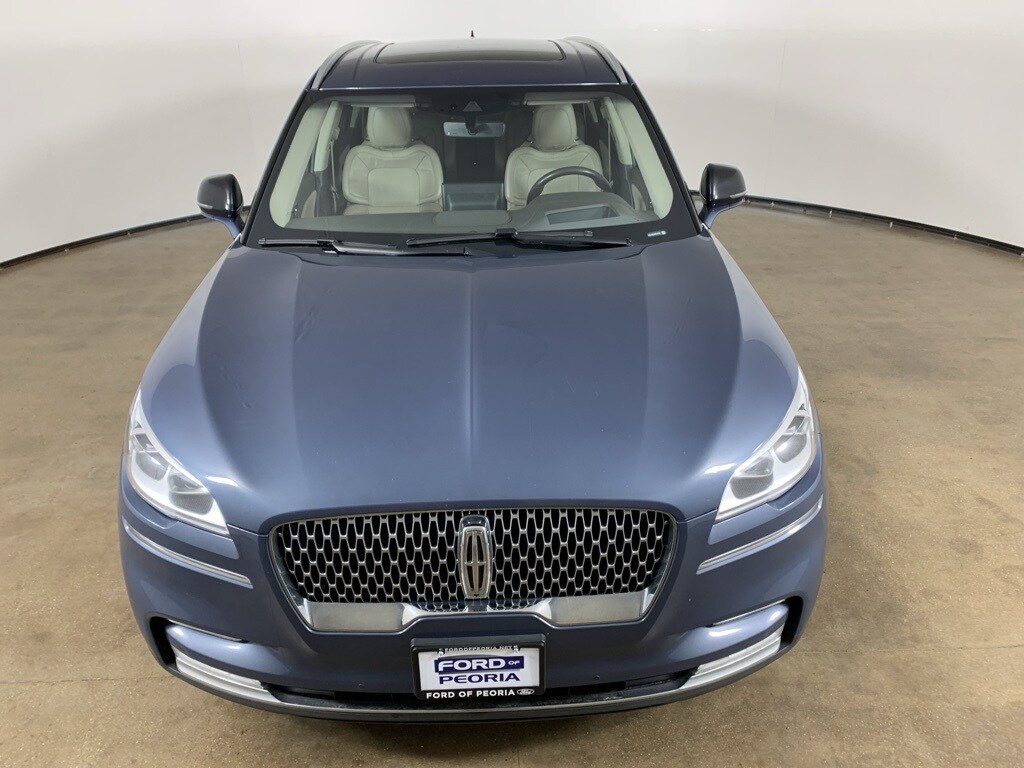 Ocean Drive Blue Metallic 2021 Lincoln Aviator Reserve AWD with Sandstone premium leather interior - available now at Ford of Peoria in Peoria, IL. This AutoCheck one-owner Lincoln Aviator Reserve delivers refined luxury, powerful twin-turbo performance, and advanced technology, making it an exceptional three-row SUV for drivers who want comfort, confidence, and sophistication in every drive. Under the hood is a smooth and responsive 3.0-liter twin-turbocharged V6 engine paired with a 10-speed automatic transmission, providing strong acceleration and composed highway performance. Intelligent All-Wheel Drive enhances traction in all conditions. The title is "Clean". This vehicle presents in excellent overall condition, offering a premium blend of performance and comfort.
