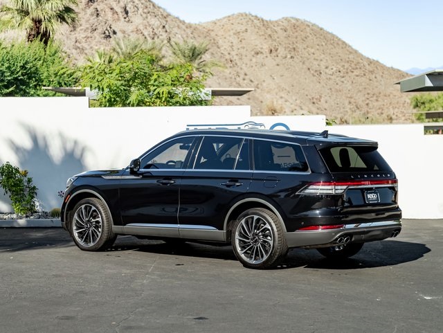 Land Rover Rancho Mirage is delighted to showcase this Pre-Owned 2021 Lincoln Aviator Reserve AWD. Dressed in an evocative Infinite Black and with just 47,690 miles to its name, this vehicle is a testament to the potent combination of high performance and sophistication that Lincoln embodies. The Aviator Reserve projects an unmistakable presence with 22" machined alloy wheels, chrome mesh grille, quad-tip dual exhaust system, and a sweeping panoramic Vista Roof with power shade. Finished in Infinite Black, it exudes a polished elegance, complemented by the Class IV Trailer Tow Package for added utility and capability. Step inside and the cabin wraps you in a refined Ebony leather interior equipped with heated front seats with memory, powerfold third-row seating, and quad-zone climate control. Technology abounds with a 12" digital instrument cluster, 10" centerstack touchscreen, SYNC 3 with voice-activated navigation, and an intuitive 360-degree camera system. This 2021 Lincoln Aviator is far more than just a car; it is the embodiment of the brand's commitment to peak automotive engineering and opulent design.