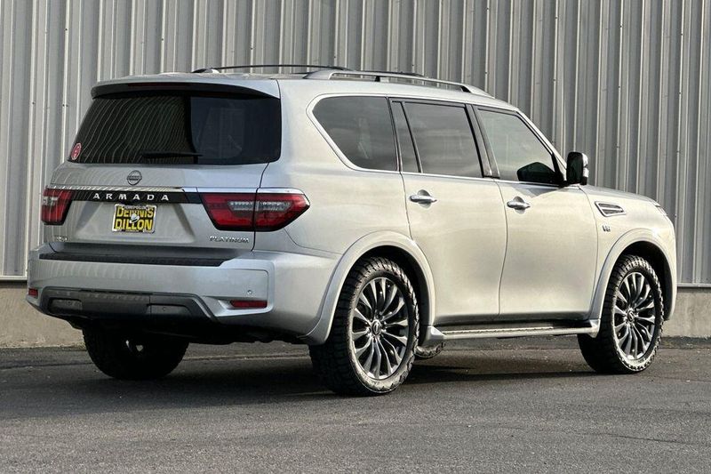 We are grateful that you have given us the opportunity to earn your business. Dillon GMC Guarantees your best price on every vehicle in stock. Plus, buy with peace of mind when purchasing a New or Used vehicle with our Love It or Leave It Guarantee! Have a trade in? We need your current vehicle and will pay you top value for nearly any auto, powersport, motorcycle, boat, etc. Come see why Dillon GMC is your best choice for a New or Used vehicle. Your satisfaction is our top priority. That's the Dillon Difference! This 2021 Nissan Armada Platinum is a true standout in the full-size SUV segment. Boasting a powerful 5.6L V8 engine with 400 horsepower, this Armada delivers exceptional performance and capability. With its commanding 4WD system and advanced suspension, you'll conquer any terrain with confidence and comfort. The stunning Silver exterior complements the Armada's bold, muscular styling, while the luxurious Platinum trim level elevates the experience with premium features. Step inside and you'll be greeted by the spacious, well-appointed cabin, featuring rich leather upholstery, heated and ventilated front seats, and a panoramic moonroof that floods the interior with natural light. Technology is at the forefront, with the intuitive NissanConnect infotainment system, complete with navigation, Apple CarPlay, and Android Auto integration. The premium 13-speaker audio system will immerse you in your favorite music, while the advanced safety suite, including features like blind spot monitoring and rear automatic braking, gives you peace of mind on the road. Whether you're embarking on a family adventure or tackling your daily commute, this 2021 Nissan Armada Platinum is the perfect companion. With its uncompromising blend of power, luxury, and technology, it's a vehicle that will exceed your expectations and make every journey a pleasure. We invite you to experience the exceptional capabilities and refined elegance of this Armada for yourself. Schedule a test drive today and discover why this remarkable SUV should be at the top of your list. Family owned and operated for over 50 years!