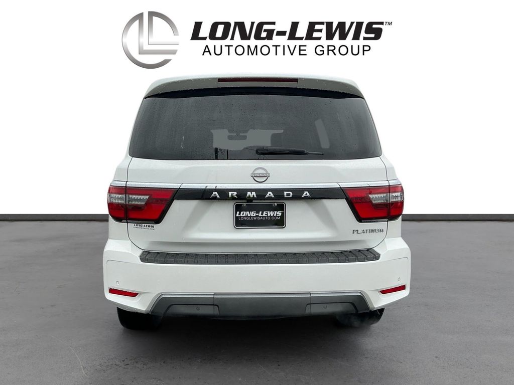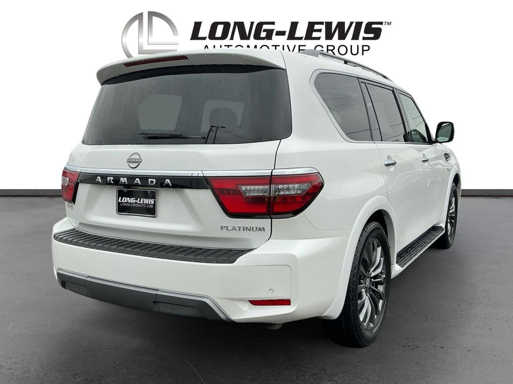 2021 Nissan Armada Platinum Aspen White Tricoat Platinum 4WD 7-Speed Automatic 5.6L V8 DOHC 32V LEV3-ULEV125 400hp 4WD, 13 Speakers, 2.94 Axle Ratio, 2nd Row Captain's Chairs, 2nd Row Center Console w/Padded Armrest, 3rd Row Carpeted Floor Mats - Captain Seat, 3rd row seats: split-bench, 4-Wheel Disc Brakes, A/V remote, ABS brakes, Air Conditioning, Alloy wheels, AM/FM radio: SiriusXM, Anti-whiplash front head restraints, Auto High-beam Headlights, Auto tilt-away steering wheel, Auto-dimming door mirrors, Auto-dimming Rear-View mirror, Auto-leveling suspension, Automatic temperature control, Brake assist, Bumpers: body-color, Captain's Chairs Package, Climate-Controlled Front Bucket Seats, Cross Bars, Delay-off headlights, Driver door bin, Driver vanity mirror, Dual front impact airbags, Dual front side impact airbags, Emergency communication system: NissanConnect Services, Exterior Parking Camera Rear, Four wheel independent suspension, Front anti-roll bar, Front Bucket Seats, Front Center Armrest, Front dual zone A/C, Front fog lights, Front reading lights, Fully automatic headlights, Garage door transmitter: HomeLink, Headphones, Heated door mirrors, Heated front seats, Heated rear seats, Heated steering wheel, Illuminated entry, Leather Shift Knob, Low tire pressure warning, Memory seat, Navigation System, NissanConnect featuring Apple CarPlay and Android Auto, Occupant sensing airbag, Outside temperature display, Overhead airbag, Overhead console, Panic alarm, Passenger door bin, Passenger vanity mirror, Power door mirrors, Power driver seat, Power Liftgate, Power moonroof, Power passenger seat, Power steering, Power windows, Quilted Leather Seat Trim, Radio: NissanConnect w/SiriusXM, Rain sensing wipers, Rear air conditioning, Rear anti-roll bar, Rear reading lights, Rear seat center armrest, Rear window defroster, Rear window wiper, Reclining 3rd row seat, Remote keyless entry, Security system, Special Paint - Aspen White, Speed control, Speed-sensing steering, Speed-Sensitive Wipers, Split folding rear seat, Spoiler, Steering wheel memory, Steering wheel mounted audio controls, Tachometer, Telescoping steering wheel, Tilt steering wheel, Traction control, Trip computer, Turn signal indicator mirrors, Variably intermittent wipers, Ventilated front seats, Voltmeter.