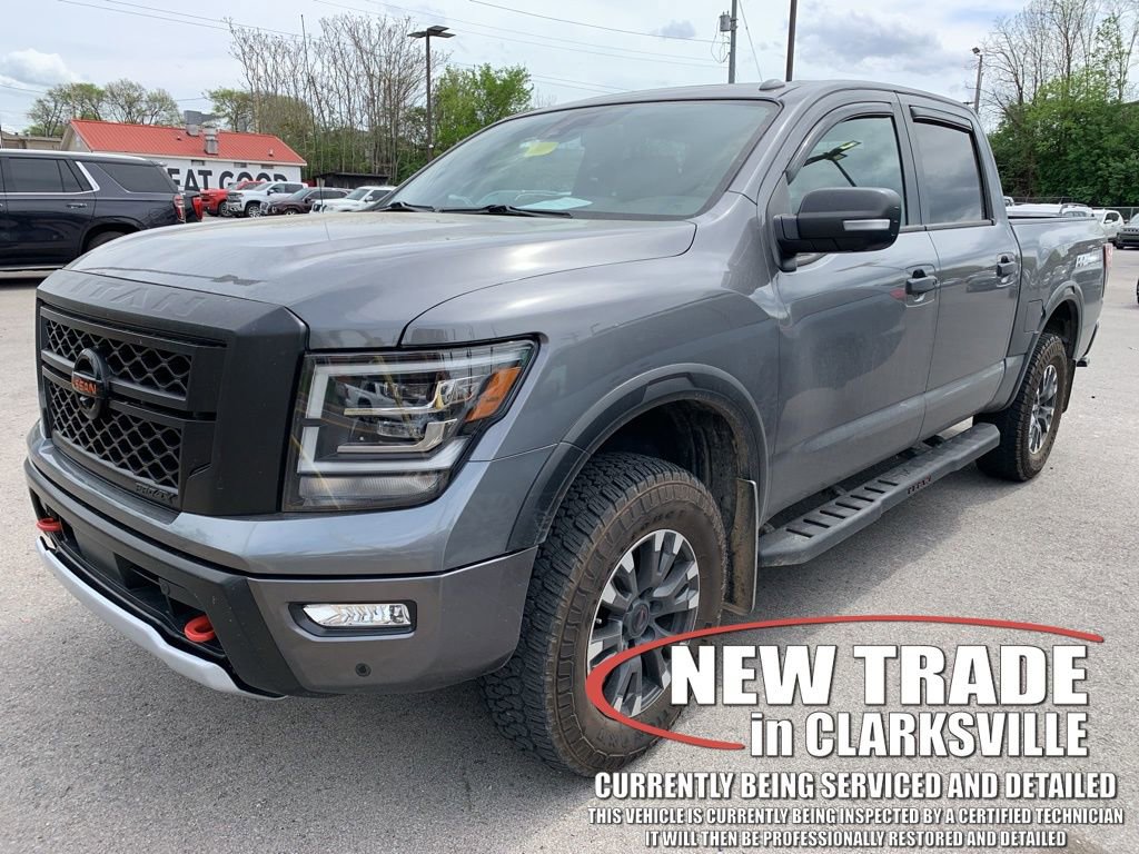 Clean CARFAX. Gun Metallic 2021 Nissan Titan PRO-4X. The Pre-Owned 2021 Nissan Titan PRO-4X with 5.6L V8 DOHC 32V 400hp at Serra Clarksville. Well equipped. Serra Cadillac Clarksville embodies a commitment to quality, integrity, and customer satisfaction with our Veteran Owned, Value Driven culture. With a vast selection of top-tier pre-owned vehicles, we cater to a diverse range of preferences, lifestyles and budgets. When you are searching for a pre-owned SUV or used truck near Nashville, look no further than Serra Cadillac Clarksville.