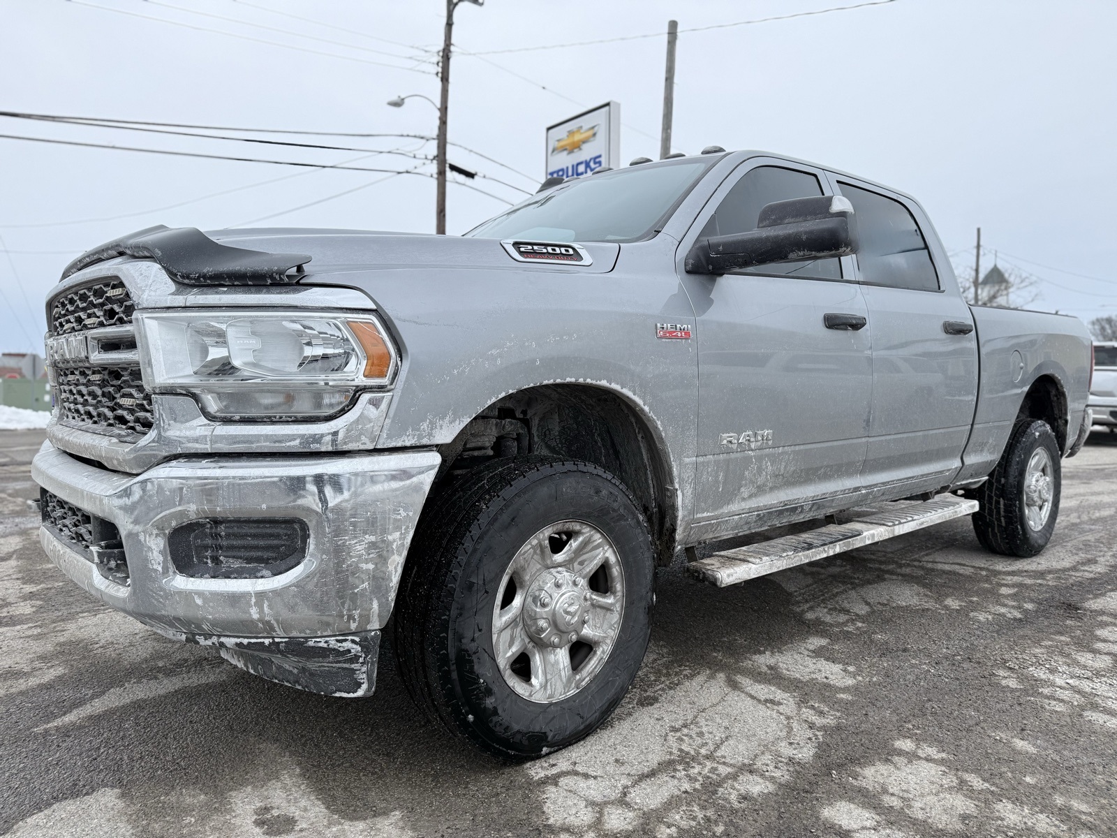 This 2021 Ram 2500 Tradesman Crew Cab Medium Bed is finished in Billet Silver Metallic Clearcoat over a Black cloth interior. Power comes from a 6.4L HEMI V8 paired with an 8-speed automatic transmission and part-time four-wheel drive, backed by a 3.73 axle ratio, HD suspension, and a GVWR of 10,000 lbs. The Tradesman Level 2 Equipment Group adds rear defrost and satellite radio, while the Chrome Appearance Group brings steel wheels and all-season tires on all four corners. Inside, you get a split-bench front seat, rear bench seat, adjustable steering wheel, dual 12V power outlets, and full cloth headliner with map lights and a center armrest with storage. Technology highlights include a Uconnect audio system with AM/FM radio, Android Auto, Apple CarPlay, Bluetooth connectivity, HD Radio, smart device integration, and a back-up camera. Additional utility features include a tow hitch, integrated trailer brake controller, 115V auxiliary front outlet, LED bed lighting, clearance lamps, heated power mirrors with integrated turn signals, and automatic headlights with daytime running lamps.