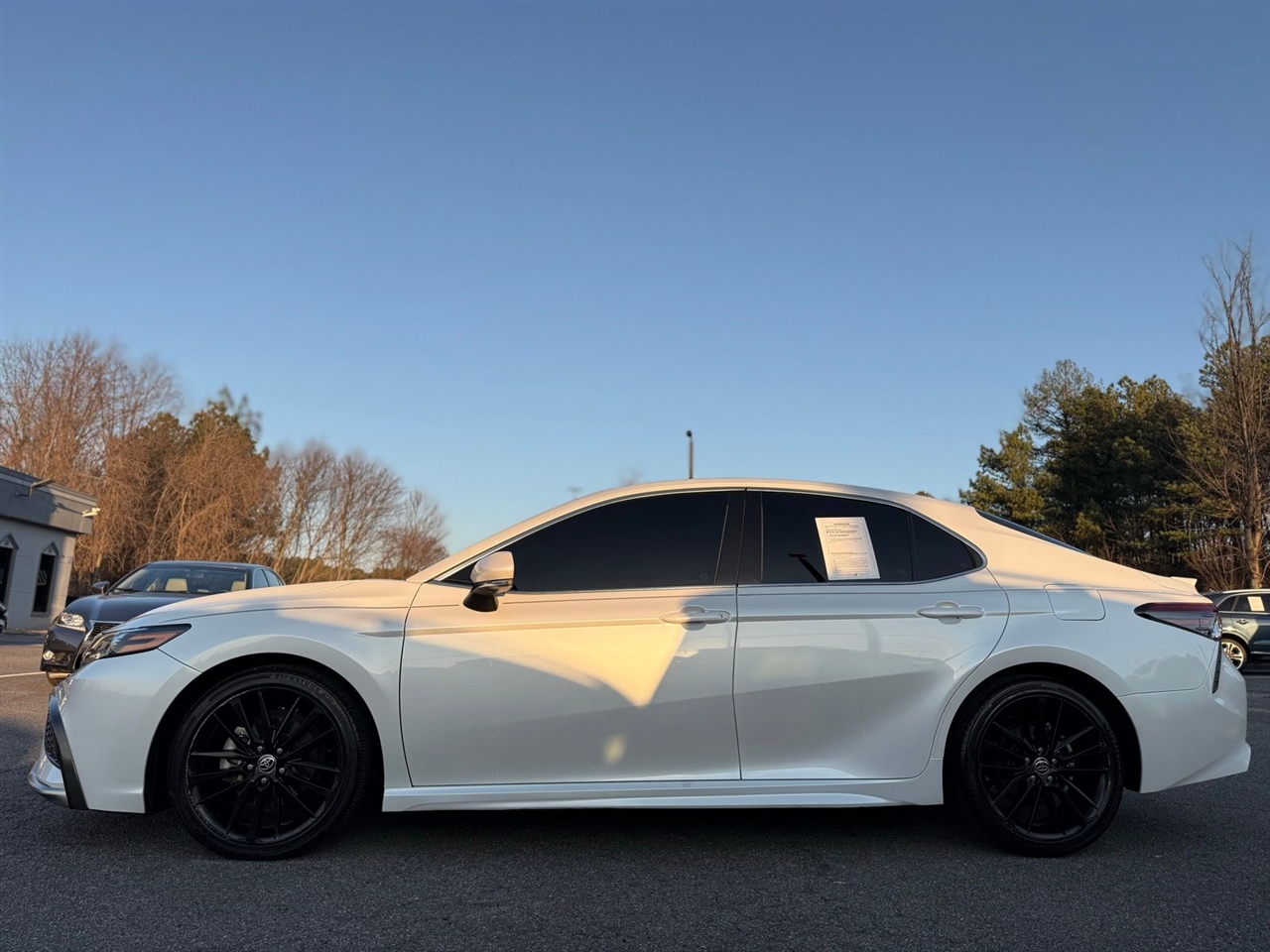 White 2021 Toyota Camry XSE FWD 8-Speed Automatic 2.5L I4 DOHC 16V kbb, Black Leather, 4-Wheel Disc Brakes, 6 Speakers, ABS brakes, Air Conditioning, Alloy wheels, AM/FM radio: SiriusXM, Apple CarPlay/Android Auto, Auto High-beam Headlights, Auto-dimming Rear-View mirror, Automatic temperature control, Brake assist, Bumpers: body-color, Carpet Mat Package (TMS), Delay-off headlights, Driver door bin, Driver vanity mirror, Dual front impact airbags, Dual front side impact airbags, Electronic Stability Control, Emergency communication system: Safety Connect with 1-year trial, Exterior Parking Camera Rear, Four wheel independent suspension, Front anti-roll bar, Front Bucket Seats, Front Center Armrest, Front dual zone A/C, Front reading lights, Fully automatic headlights, Garage door transmitter: HomeLink, Heated door mirrors, Heated front seats, Illuminated entry, Knee airbag, Low tire pressure warning, Multi-Stage Heated Front Bucket Seats, Navigation Package, Navigation System, Occupant sensing airbag, Outside temperature display, Overhead airbag, Overhead console, Panic alarm, Passenger door bin, Passenger vanity mirror, Perforated Leather Seat Trim, Power door mirrors, Power driver seat, Power passenger seat, Power steering, Power windows, Radio data system, Radio: AM/FM/HD Audio Plus, Rear anti-roll bar, Rear reading lights, Rear seat center armrest, Rear side impact airbag, Rear window defroster, Remote keyless entry, Security system, Speed control, Speed-sensing steering, Split folding rear seat, Spoiler, Steering wheel mounted audio controls, Tachometer, Telescoping steering wheel, Tilt steering wheel, Traction control, Trip computer, Turn signal indicator mirrors, Variably intermittent wipers, Wheels: 8.0J x 19" Black Machined-Finish Alloy. Recent Arrival! Odometer is 4576 miles below market average! 27/38 City/Highway MPG.