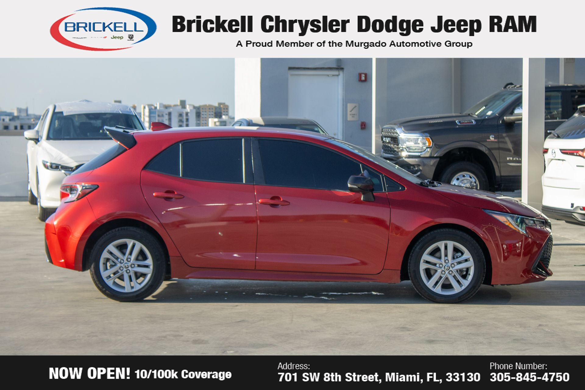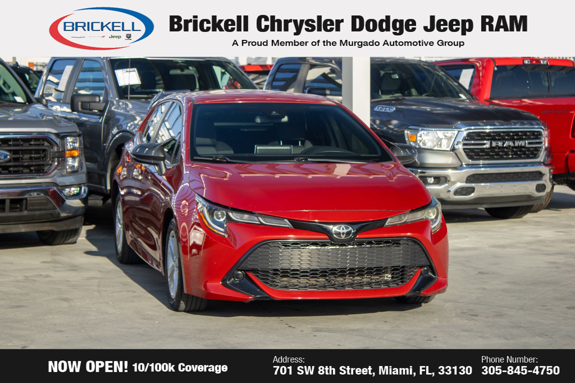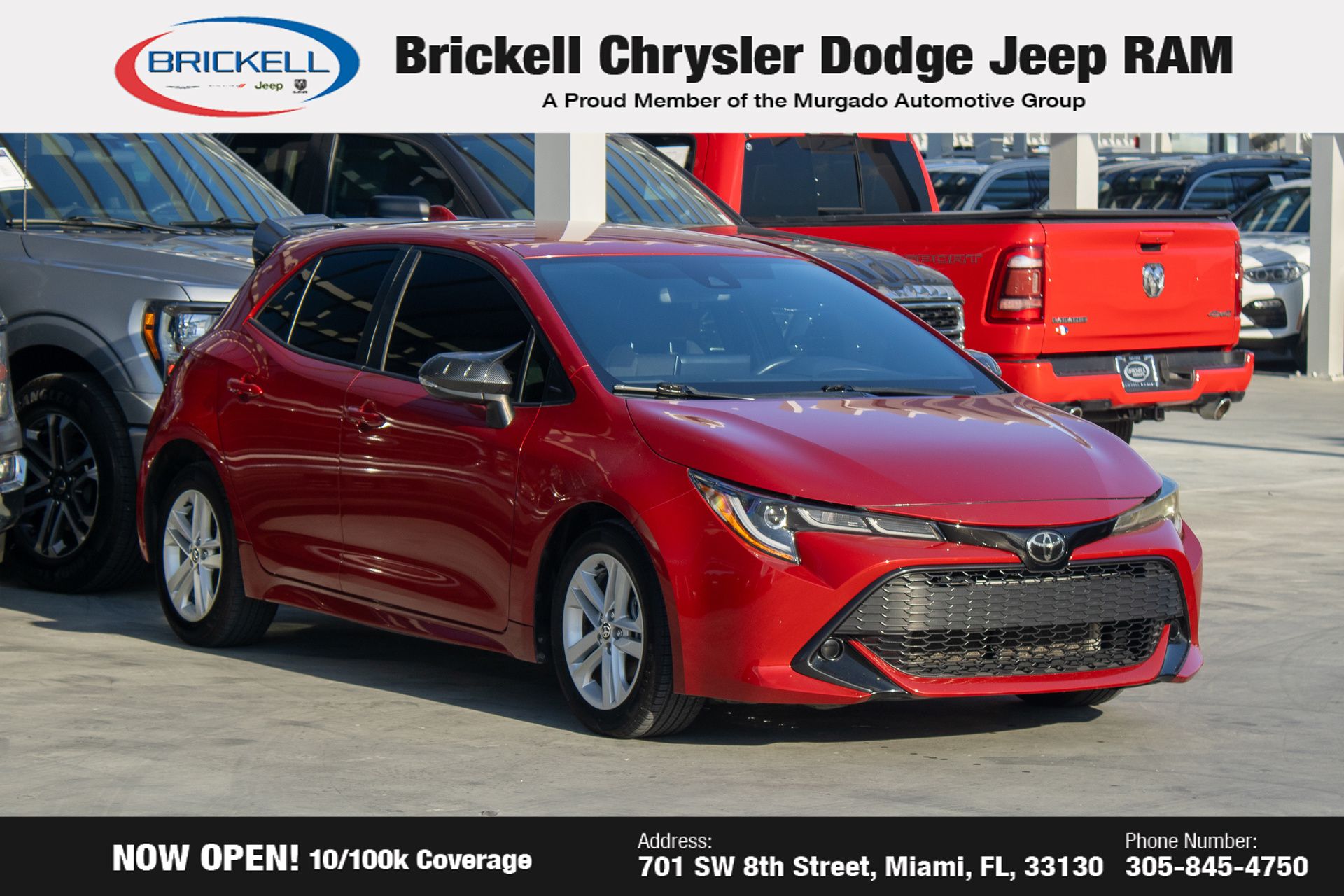 - Find your perfect pre-owned vehicle at Brickell Chrysler Dodge Jeep Ram. Every pre-owned vehicle is thoroughly inspected to ensure quality and reliability. For added confidence, we include a 10-year/100,000-mile powertrain warranty on all non-European brands at no additional cost. Our dealership offers one of the largest selections of pre-owned inventory in the region, so you can find the right car, truck, or SUV for your needs. Our state-of-the-art service department, the largest in the country, is open seven days a week from 7 AM to 9 PM, ensuring your vehicle stays in top condition. Visit us at 701 SW 8th St, Miami, FL 33130, or call 305-777-2800 to learn more and schedule a test drive.