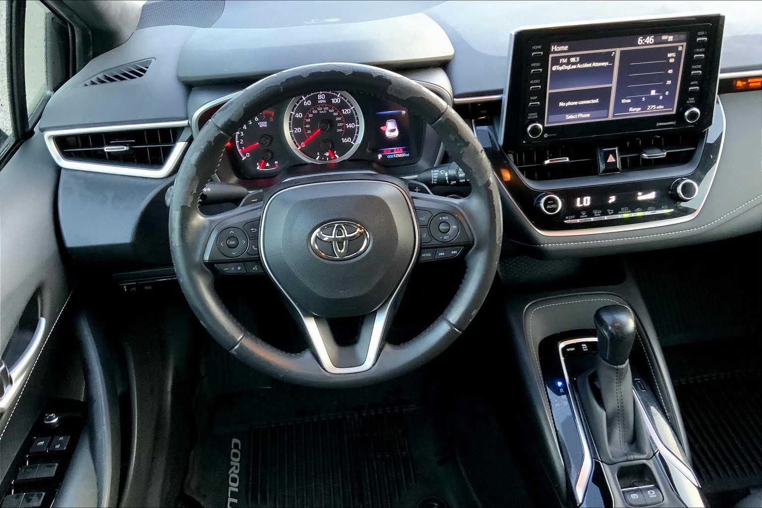 This used 2021 Toyota Corolla Hatchback SE Nightshade Edition is located at Rivertown Toyota. It features a midnight black metallic exterior and black interior. The vehicle includes lane departure alert, automatic temperature control, emergency communication system, wireless phone connectivity, and a back-up camera.