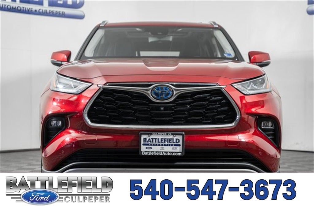 2.5L I4 PDI Hybrid DOHC 16V LEV3-SULEV30 186hp. Odometer is 18476 miles below market average! 2021 Toyota Highlander Hybrid Platinum Burgundy 35/34 City/Highway MPG Awards: * ALG Residual Value Awards, Residual Value Awards We strive to provide accurate information, but please verify options and price before purchasing. All vehicles are subject to prior sale and financing is subject to approved credit. Battlefield Ford is not liable for errors or omissions. Quoted prices available on in-stock units only. E-Price excludes tax, tags, freight and $999 Processing Fee. All customers will qualify for all manufacturer rebates and incentives included in the E- Price, some require financing through the manufacturer. Some manufacturer rebates are not compatible with special manufacturer finance offers. Manufacturer rebates and incentives are valid during the time period set by the manufacturer and are subject to change without notice. Additional manufacturer rebates such as but not limited to college graduates, Military and additional incentives may apply to those who qualify and may lower the sales price. Rebates and Incentives may vary based on your zip code. See dealer for details.