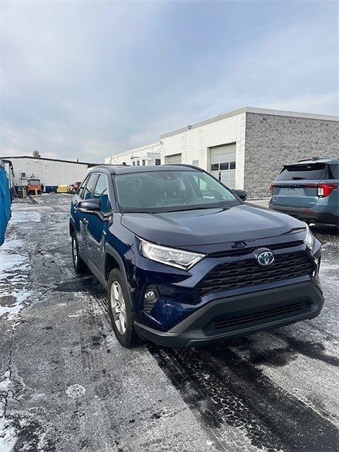 Dark Blue 2021 Toyota RAV4 Hybrid XLE AWD eCVT 2.5L 4-Cylinder 2.5L 4-Cylinder, 4-Wheel Disc Brakes, 6 Speakers, ABS brakes, Air Conditioning, AM/FM radio: SiriusXM, AM/FM Stereo, Apple CarPlay/Android Auto, Auto High-beam Headlights, Automatic temperature control, Axle Ratio: TBD, Brake assist, Bumpers: body-color, Convenience Package, Delay-off headlights, Driver door bin, Driver vanity mirror, Dual front impact airbags, Dual front side impact airbags, Electronic Stability Control, Emergency communication system: Safety Connect with 1-year trial, Exterior Parking Camera Rear, Fabric Seat Trim (FA), Four wheel independent suspension, Front anti-roll bar, Front Bucket Seats, Front Center Armrest, Front Door Smart Key System w/Push Button Start, Front dual zone A/C, Front fog lights, Front reading lights, Front Seat Heating, Front Sport Seats, Fully automatic headlights, Heated 3-Spoke Leather Steering Wheel, Heated door mirrors, Illuminated entry, Knee airbag, Lane Departure Warning System, Low tire pressure warning, Occupant sensing airbag, Outside temperature display, Overhead airbag, Overhead console, Panic alarm, Passenger door bin, Passenger vanity mirror, Power door mirrors, Power driver seat, Power steering, Power windows, Rain Sensing Front Wipers, Rear anti-roll bar, Rear seat center armrest, Rear window defroster, Rear window wiper, Remote keyless entry, Roof rack: rails only, Speed control, Speed-sensing steering, Split folding rear seat, Spoiler, Steering wheel mounted audio controls, Telescoping steering wheel, Tilt steering wheel, Traction control, Trip computer, Turn signal indicator mirrors, Variably intermittent wipers, Wheels: 17" x 7.0J Silver Aluminum Alloy, Wiper Deicer, XLE Grade Weather Package. 13 consecutive presidents award winner! Recent Arrival! 41/38 City/Highway MPG Edmunds 5 star Dealer!