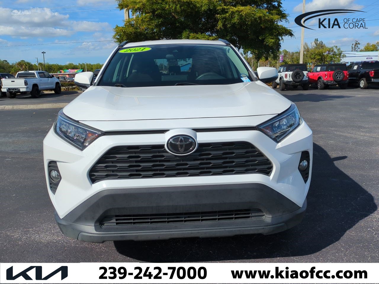 RAV4 XLE, 4D Sport Utility, 2.5L 4-Cylinder DOHC Dual VVT-i, 8-Speed Automatic, FWD, Super White, Black Cloth. 2021 Toyota RAV4 XLE Super White RAV4 XLE FWD 2.5L 4-Cylinder DOHC Dual VVT-i 8-Speed Automatic. 28/35 City/Highway MPG. CALL THE ALL-NEW KIA OF CAPE CORAL TODAY AT (239) 242-7000 TO CHECK AVAILABILITY AND SCHEDULE A TEST DRIVE! We are located at 404 NE Pine Island Rd, Cape Coral FL 33909. While we strive for accuracy, dealer is not responsible for errors in standard equipment or options listed. All prices include dealer assisted financing, see dealer for details.