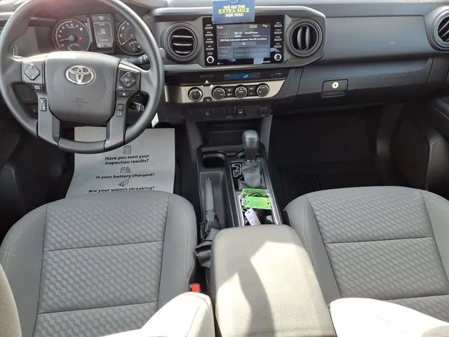 Discover the 2021 Toyota Tacoma, a versatile and dependable pickup truck that combines rugged performance with modern technology. With just over 5,300 miles, this used model boasts a sleek Silver Sky Metallic exterior and a comfortable gray interior, making it an attractive choice for both work and leisure. Powered by a 3.5-liter V6 engine delivering 278 horsepower and 265 lb-ft of torque, this Tacoma offers impressive capability and smooth handling through its 6-speed automatic transmission and 4WD drivetrain. Designed for adventure, it features a tow package that enhances hauling capacity and satellite radio readiness for entertainment on the go. Modern amenities include Apple CarPlay, Bluetooth connectivity, adaptive cruise control, and a Wi-Fi hotspot, providing a seamless driving experience. Whether navigating city streets or tackling off-road trails, this Tacoma is equipped to meet your needs with style and reliability. The Tacoma offers essential safety features such as dual front knee airbags and active head restraints to enhance occupant protection. Additionally, 4-wheel anti-lock brakes (ABS) provide reliable stopping power, especially on challenging surfaces, ensuring confidence behind the wheel in diverse driving conditions. The Tacoma is packed with advanced entertainment and connectivity options. It supports smart device app compatibility through Toyota Connected Services, enabling seamless integration with your smartphone. Hands-free voice-operated phone calls and a voice-controlled radio enhance convenience, while the touch screen display provides easy access to entertainment options. Amazon Alexa compatibility allows for connected in-car apps, and electronic messaging assistance with a read function helps keep you connected safely. The audio system features six speakers, along with auxiliary inputs for USB and iPod/iPhone devices, delivering high-quality sound for every trip. Performance-wise, the Tacoma features an electronic hi-lo 4WD selector, allowing drivers to switch between high and low ranges for optimal traction in off-road or slippery conditions. Its part-time 4WD system ensures versatility and control, making it a dependable choice for both daily driving and adventurous pursuits.