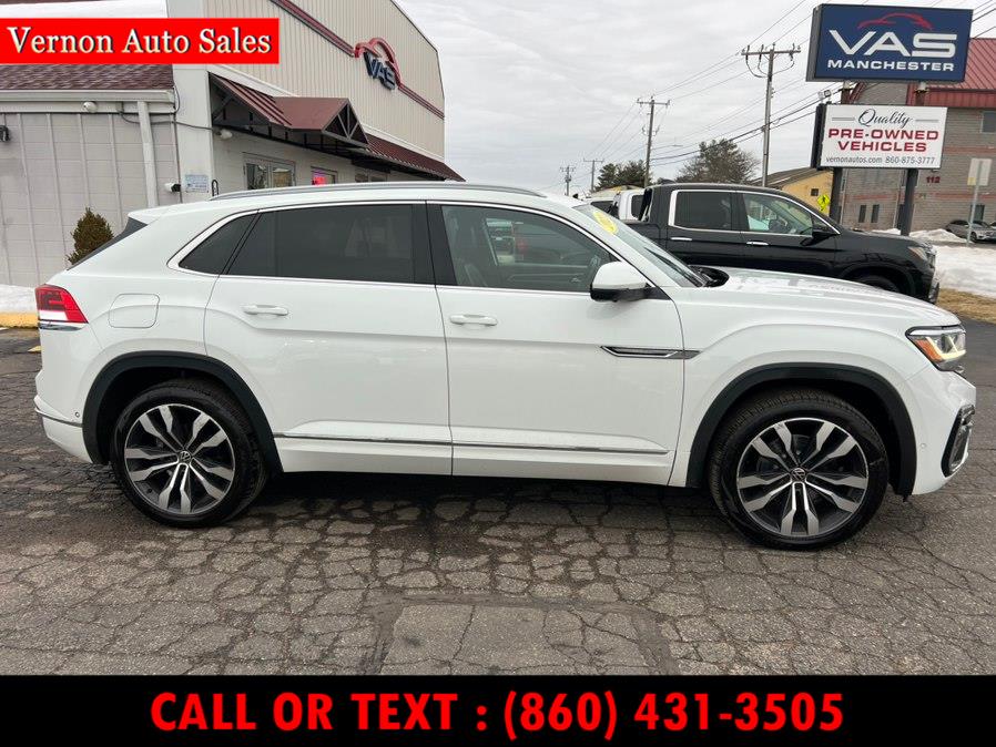 This 2021 Volkswagen Atlas Cross Sport is available for sale in Manchester, Connecticut at Vernon Auto Sale & Service. It features a 3.6L V6 engine, all wheel drive, and a luxurious interior with leather seats. The vehicle is in good condition and has not been backed by a powertrain warranty.