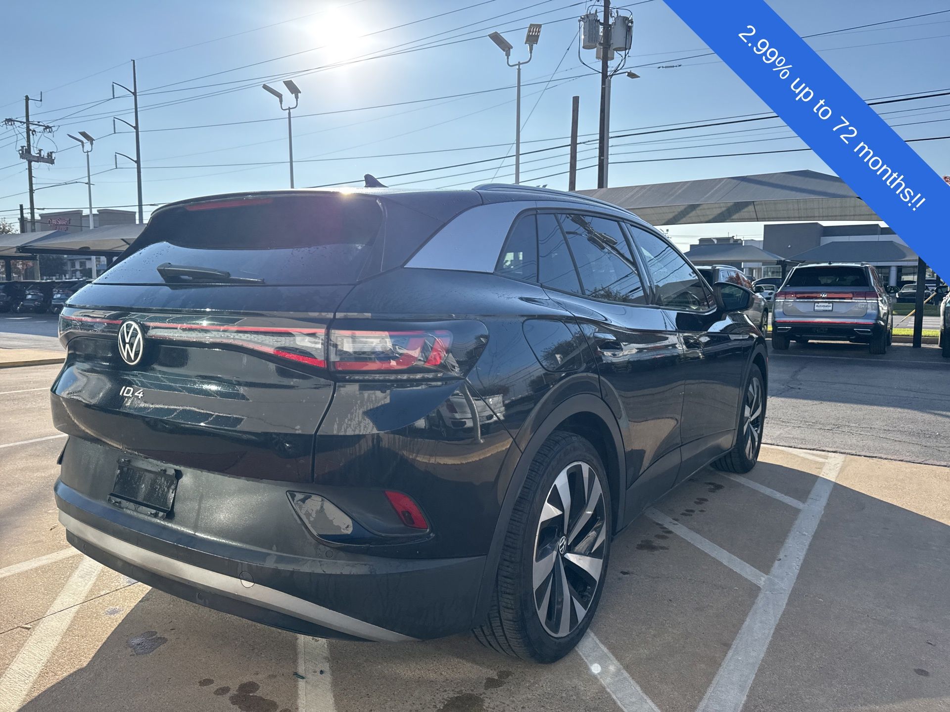 2021 Volkswagen ID.4 Pro S Black. This 2021 Volkswagen ID.4 Pro S in Black comes with the following features: Electric Motor Single-Speed Automatic RWD 4 Wheel Independent Suspension, 4.39 Axle Ratio, 7 Speakers, ABS brakes, Air Conditioning, Alloy wheels, Auto High-beam Headlights, Auto-dimming Rear-View mirror, Automatic temperature control, Brake assist, Bumpers: body-color, Delay-off headlights, Driver door bin, Driver vanity mirror, Driver's Seat Mounted Armrest, Dual front impact airbags, Dual front side impact airbags, Electronic Stability Control, Emergency communication system: VW Car-Net services (capabilities require enrollment or subscription), Exterior Parking Camera Rear, Four wheel independent suspension, Front anti-roll bar, Front Bucket Seats, Front dual zone A/C, Front fog lights, Front reading lights, Fully automatic headlights, Heated door mirrors, Heated Front Seats, Heated front seats, Heated steering wheel, Illuminated entry, Low tire pressure warning, Memory seat, Navigation System, Occupant sensing airbag, Outside temperature display, Overhead airbag, Overhead console, Panic alarm, Passenger door bin, Passenger seat mounted armrest, Passenger vanity mirror, Perforated V-Tex Leatherette Seating Surfaces, Power door mirrors, Power driver seat, Power Liftgate, Power passenger seat, Power steering, Power windows, Radio data system, Radio: Discover Pro Max w/12" Touchscreen Nav, Rain sensing wipers, Rear anti-roll bar, Rear reading lights, Rear seat center armrest, Rear window defroster, Rear window wiper, Remote keyless entry, Roof rack: rails only, Speed control, Speed-sensing steering, Split folding rear seat, Spoiler, Steering wheel mounted audio controls, Telescoping steering wheel, Tilt steering wheel, Traction control, Trip computer, Turn signal indicator mirrors, Variably intermittent wipers, and Wheels: 19" 5-Spoke 2-Tone Machined Alloy.