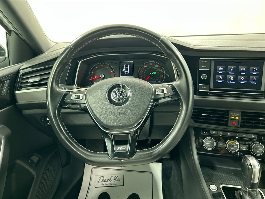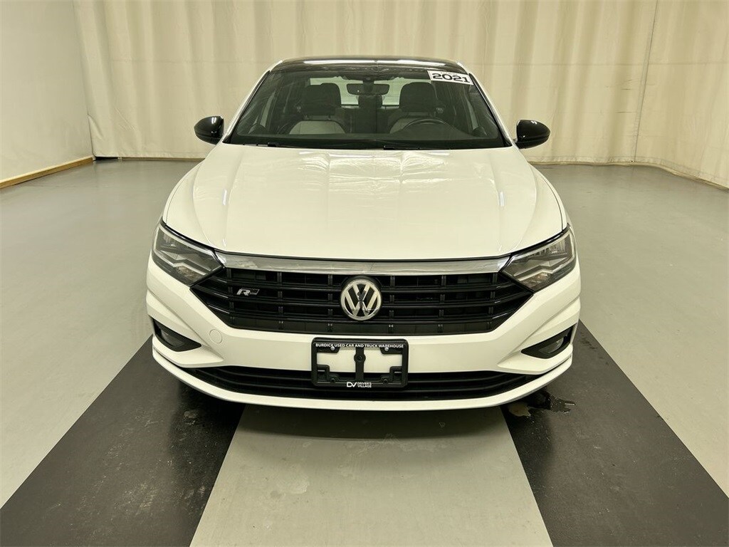 Pure White 2021 Volkswagen Jetta R-Line FWD 8-Speed Automatic 1.4L TSI. One owner vehicle, Fl Artificial Leather, Heated front seats, Power moonroof: Panoramic. 29/39 City/Highway MPG.