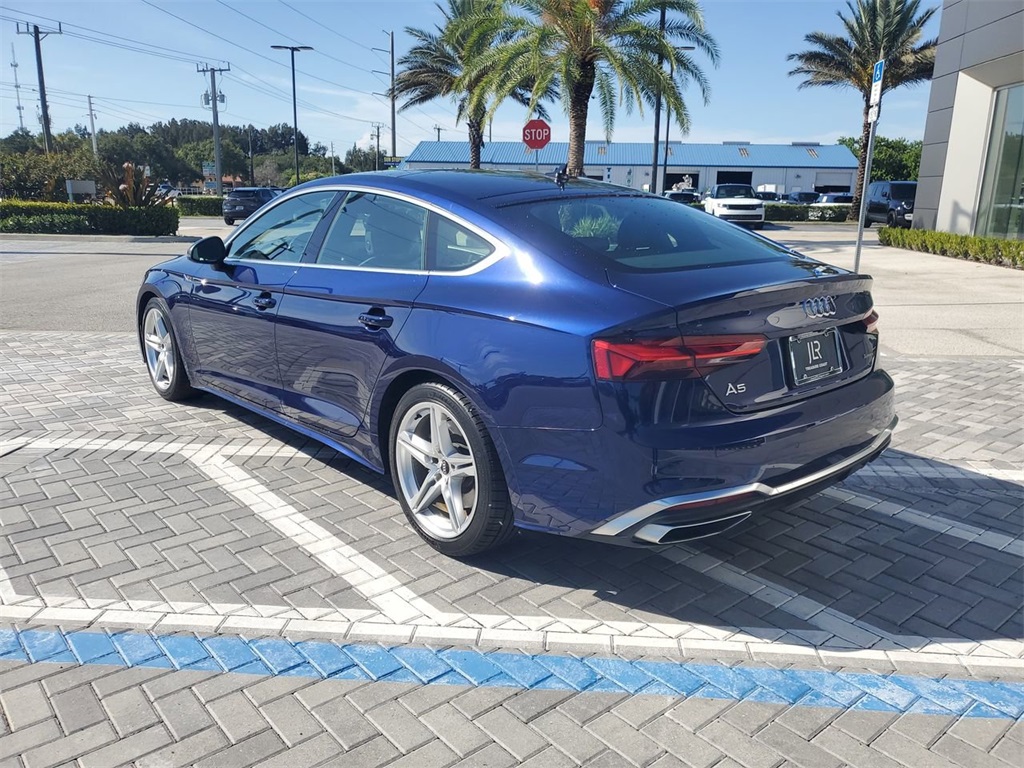 This 2022 Navarra Blue Metallic Audi A5 Sportback Premium AWD is well equipped and includes these features and benefits: 7-Speed Automatic S tronic 2.0L 4-Cylinder TFSI 24/31 City/Highway MPG Clean CARFAX. Alarm System w/Motion Sensors, Audi Advanced Key, Audi Side Assist w/Pre Sense Rear, Auto-Dimming Exterior Mirrors w/Memory, Convenience Package, Driver Seat Memory, Exterior Parking Camera Rear, Heated Steering Wheel, Navigation System, Parking System Plus (Front/Rear Acoustic Sensors), Power Liftgate, Power moonroof, Rings Audi Beam, SiriusXM All Access Service. Discover The Difference at Jaguar Land Rover Treasure Coast!