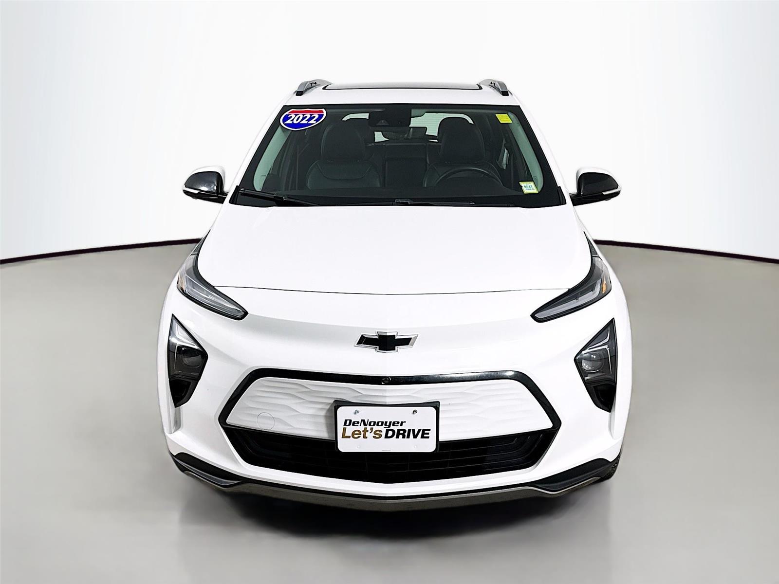 This 2022 Chevrolet Bolt EUV Premier, has a Summit White exterior and Jet Black/Nightshift Blue interior color with only 83,183 miles. New brake pads and rotors! Stock Number 43505. You can connect with us by calling (518) 241-3901. No Accidents! One Owner! Other notable features and options you should know about: Sun and Sound Package ($2,495 value) Power Dual Panel Panoramic Sunrood with Slide Chevrolet Infotainment 3 Plus System Radio with Navigation Bose Premium 7-Speaker Audio System Preferred Equipment Group 2LZ Safety and Security Forward collision mitigation - Forward thinking. You look away for just a second and suddenly the vehicle in front of you has stopped. That's when the forward collision mitigation system comes to life. When it senses an impending impact, it will activate a combination of features to help prevent or reduce the severity of an accident. Forward collision mitigation is always looking ahead. Pedestrian impact prevention - An extra step toward safety. Pedestrians don't always stop, look, and listen, but with Pedestrian Impact Prevention, your vehicle is equipped to better see them and avoid them. This system constantly monitors the road ahead to identify and track pedestrians. It projects that image to an interior display screen, and should an impact become likely, Pedestrian impact prevention takes steps to avoid a collision. Rear camera - Watching your back! The rear camera helps you see obstacles and hazards you otherwise couldn't by showing enhanced images of what is behind you. The rear camera is an extra set of eyes that's both convenient and safe. Technology and Telematics Smart device mirroring - Smartphone, meet smart car. You can control your device through your vehicle's infotainment system. Smart device mirroring brings together safety and convenience by making it easier to find what you're looking for while keeping your eyes on the road. Mobile hotspot - WiFi on the fly. Connect your devices to the Internet through your vehicle's private mobile hotspot and take the internet wherever your journey takes you, without eating up your data allowance.