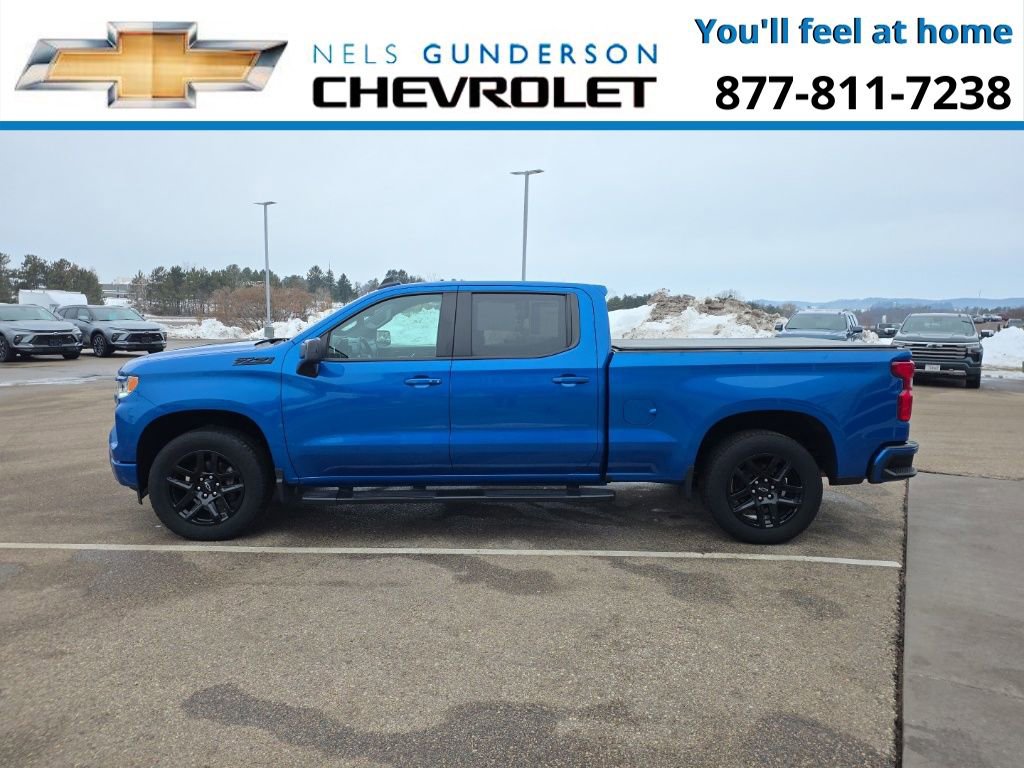 Nels Gunderson Chevrolet is honored to offer this rock solid 2022 Chevrolet Silverado 1500 RST in Glacier Blue Metallic, beautifully equipped with Cloth Rear Seat w/Storage Package, Convenience Package (10-Way Power Driver Seat w/Lumbar, 120-Volt Bed Mounted Power Outlet, 120-Volt Instrument Panel Power Outlet, Dual Rear USB Ports (Charge Only), Dual-Zone Automatic Climate Control, Electric Rear-Window Defogger, Heated Driver & Front Outboard Passenger Seats, Heated Steering Wheel, Keyless Open & Start, Leather Wrapped Steering Wheel, Manual Tilt/Telescoping Steering Column, Remote Vehicle Starter System, and Theft Deterrent System (Unauthorized Entry)), High Capacity Suspension Package, Preferred Equipment Group 1SP (12.3 Multicolor Reconfigurable Digital Display, 6-Speaker Audio System, All-Star Edition, Auto-Locking Rear Differential, Bluetooth For Phone, Chevrolet Connected Access Capable, Color-Keyed Carpeting Floor Covering, Compass, Deep-Tinted Glass, Electrical Steering Column Lock, Electronic Cruise Control, EZ Lift Power Lock & Release Tailgate, Front Frame-Mounted Black Recovery Hooks, Front LED Fog Lamps, Front Rubberized Vinyl Floor Mats, HD Rear Vision Camera, Heated Power-Adjustable Outside Mirrors, High Gloss Black Mirror Caps, Inside Rear-View Mirror w/Tilt, LED Cargo Area Lighting, OnStar & Chevrolet Connected Services Capable, Power Front Windows w/Driver Express Up/Down, Power Front Windows w/Passenger Express Down, Power Rear Windows w/Express Down, Rear 60/40 Folding Bench Seat (Folds Up), Rear Rubberized-Vinyl Floor Mats, SiriusXM w/360L, Standard Tailgate, Steering Wheel Audio Controls, Wi-Fi Hot Spot Capable, and Wireless Phone Projection), Protection Package (Chevytec Spray-On Black Bedliner and Rear Wheelhouse Liners), Standard Suspension Package, Trailering Package (Hitch Guidance), Z71 Off-Road & Protection Package (All-Weather Floor Liner (LPO) (AAK)), Z71 Off-Road Package (Dual Exhaust w/Polished Outlets, Heavy-Duty Air Filter, Hill Descent Control, and Off-Road Suspension), 10-Speed Automatic, 4WD, Black Cloth.