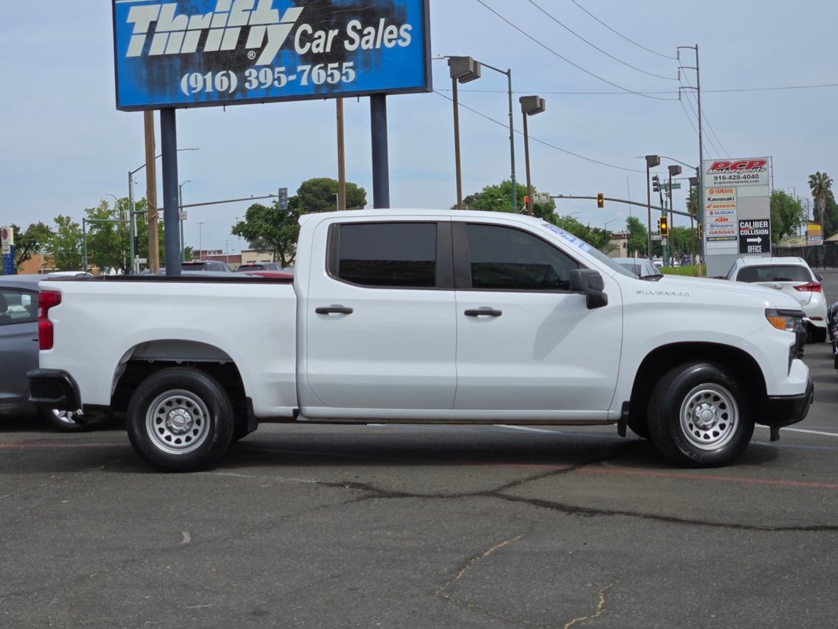 The 2022 Chevrolet Silverado 1500 2WD Crew Cab 147" Work Truck is a robust and reliable vehicle designed for practicality and performance. Sporting a sleek Summit White exterior, the truck boasts a commanding presence on the road. The contrasting Jet Black interior adds a touch of sophistication, perfect for both work and leisure. Under the hood, the Silverado is powered by a 2.7L 4-cylinder engine, ensuring efficient and powerful performance. It features the Chevytec spray-on bedliner with the Chevrolet logo, providing enhanced protection and durability for the cargo bed. Additionally, the trailering package is included, enhancing the truck's capability to tow and haul with ease. Inside, the truck is equipped with the Chevrolet Infotainment 3 System, offering seamless connectivity and entertainment options on every journey. Cruise control ensures a smooth and easy driving experience, perfect for long hauls or daily commutes. Compliance with California state emissions requirements makes it a smart choice for environmentally conscious drivers, balancing power with responsibility.