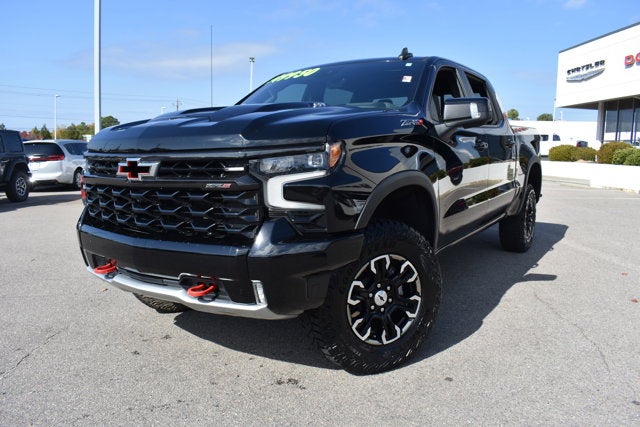 Black 2022 Chevrolet Silverado 1500 ZR2. The vehicle shown is a new Silverado. The vehicle shown is a used Silverado. The Silverado is a pickup truck. The ZR2 trim is high performance with lifted suspension and Multimatic DSSV dampers. The Silverado is available in Raleigh, NC, Wake Forest, Wilmington, and Greenville, NC.