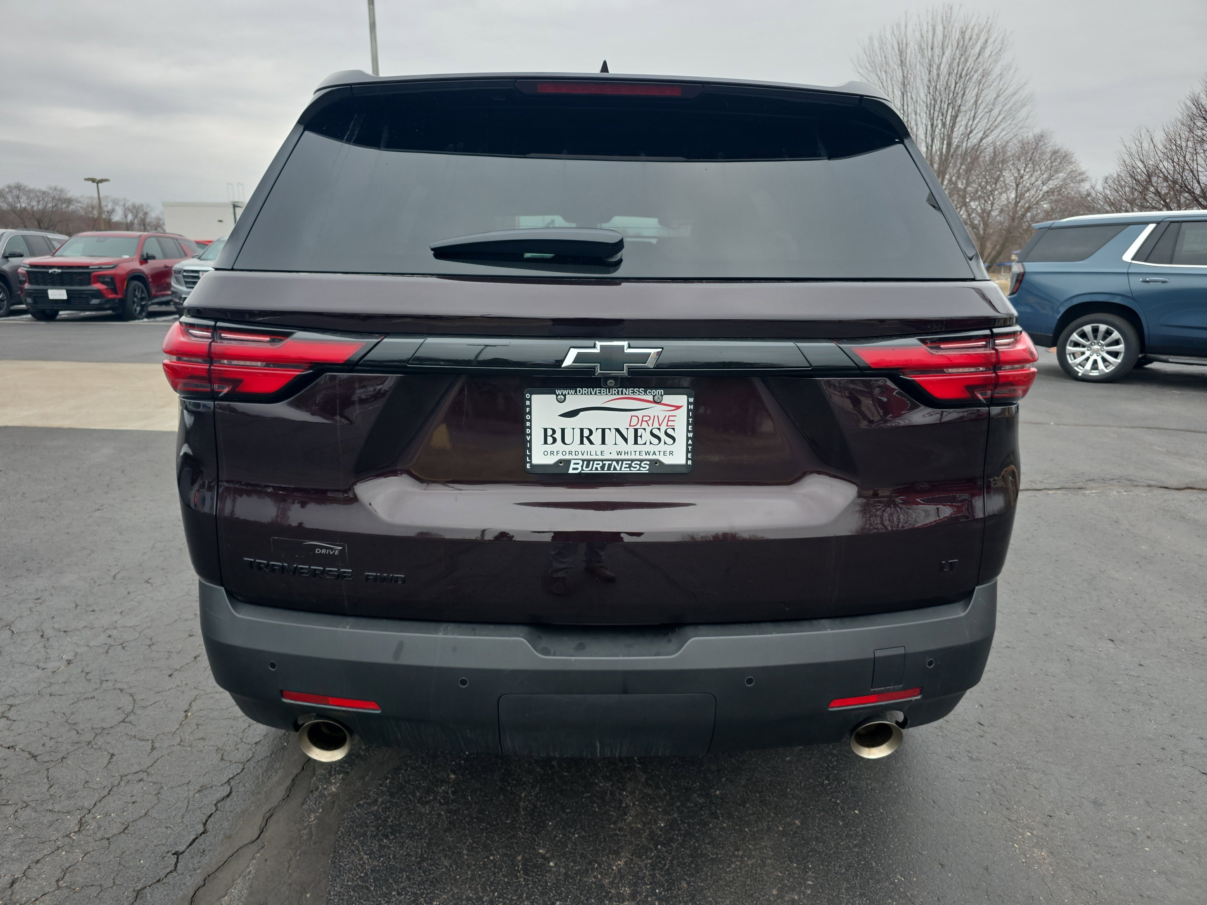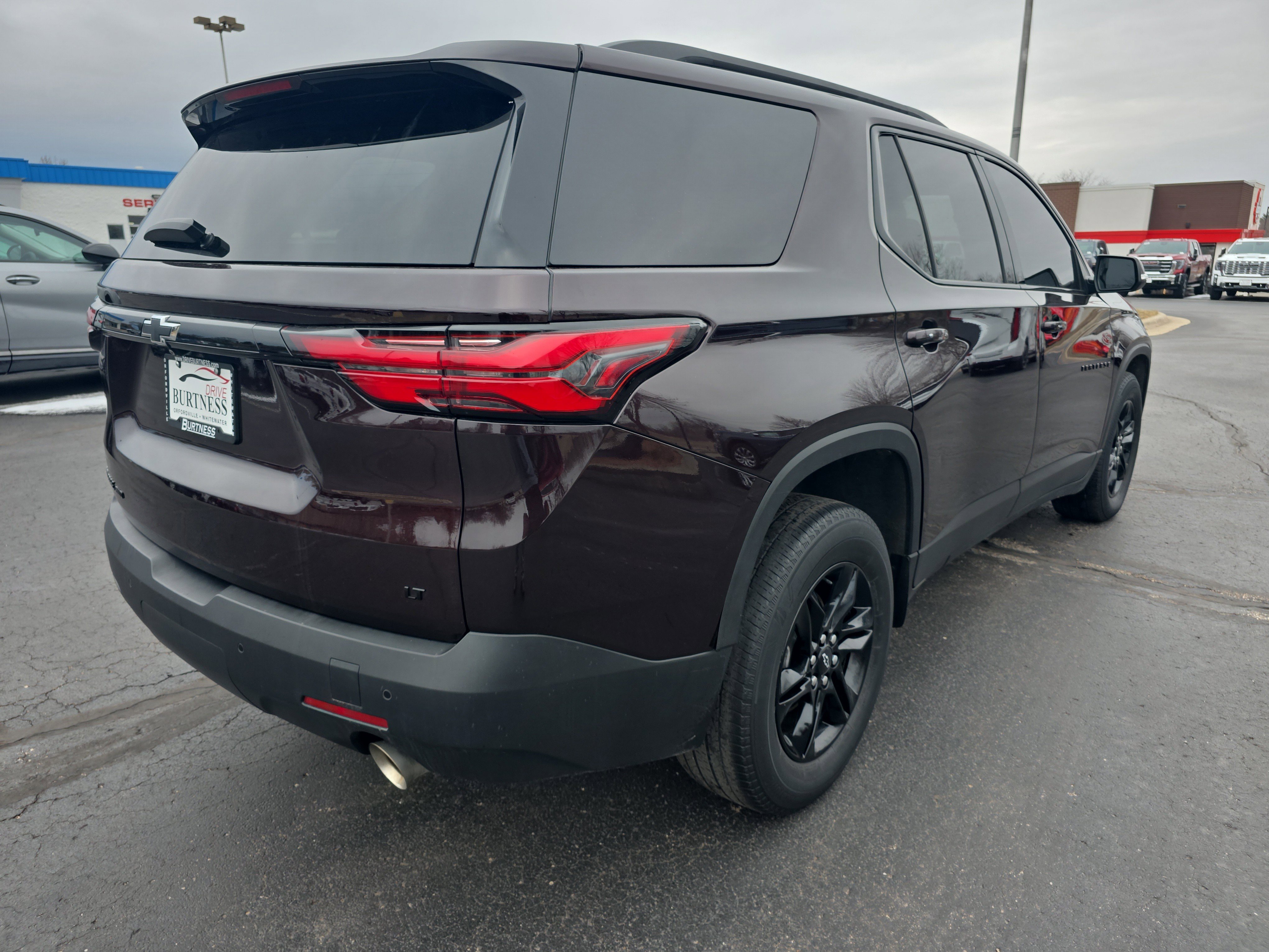 2022 Chevrolet Traverse LT 1LT Black Cherry Metallic AWD 3.6L V6 SIDI VVT 9-Speed Automatic. Midnight/Sport Edition (Black Roof Rails and Wheels: 18 Gloss Black Painted Aluminum), Preferred Equipment Group 1LT (Heated Driver & Front Passenger Seats and Rear Park Assist w/Audible Warning), 2-Way Manual Front Passenger Seat Adjuster, 3rd row seats: split-bench, 4-Wheel Disc Brakes, 6 Speakers, 8-Way Power Driver Seat Adjuster, ABS brakes, Air Conditioning, Alloy wheels, AM/FM radio: SiriusXM, Apple CarPlay/Android Auto, Auto High-beam Headlights, Automatic temperature control, Brake assist, Bright Wheel Locks (LPO), Bumpers: body-color, Compass, Delay-off headlights, Driver door bin, Driver vanity mirror, Dual front impact airbags, Dual front side impact airbags, Electronic Stability Control, Emergency communication system: OnStar Guidance, Exterior Parking Camera Rear, Four wheel independent suspension, Front anti-roll bar, Front Bucket Seats, Front Center Armrest, Front dual zone A/C, Front reading lights, Fully automatic headlights, Garage door transmitter, Heated door mirrors, Heated front seats, Illuminated entry, Leather steering wheel, Low tire pressure warning, Not Equipped w/Rear Park Assist, Occupant sensing airbag, Outside temperature display, Overhead airbag, Overhead console, Panic alarm, Passenger door bin, Passenger vanity mirror, Power door mirrors, Power Driver Lumbar Control, Power driver seat, Power Liftgate, Power steering, Power windows, Premium Cloth Seat Trim, Radio data system, Radio: Chevrolet Infotainment 3 Plus System, Rear air conditioning, Rear anti-roll bar, Rear reading lights, Rear window defroster, Rear window wiper, Remote keyless entry, Roof rack: rails only, Security system, SiriusXM w/360L, Speed control, Speed-sensing steering, Spoiler, Steering wheel mounted audio controls, Tachometer, Telescoping steering wheel, Tilt steering wheel.
