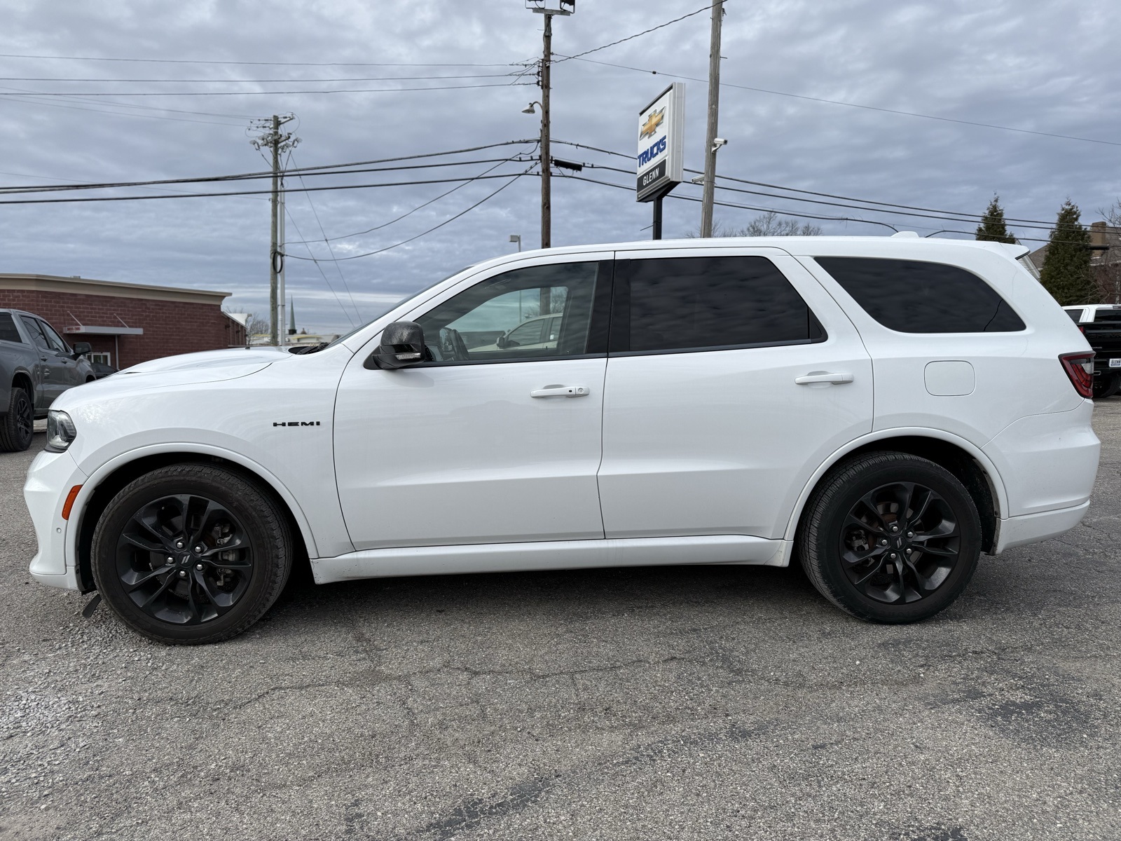 This 2022 Dodge Durango R/T is finished in White Knuckle Clearcoat and powered by a 5.7L HEMI V8 paired with an 8-speed automatic and full-time all-wheel drive. The Blacktop Package adds 20-inch alloy wheels, performance tires, and blacked-out exterior trim. Inside, you get three-row seating with second-row captain’s chairs and leather-trimmed front buckets. Comfort features include heated front seats, a heated steering wheel, tri-zone climate control, and a power liftgate. Uconnect infotainment brings navigation, HD and satellite radio, Bluetooth, and a WiFi hotspot. Safety tech includes blind-spot monitoring, rear cross-traffic alert, rear parking assist, and a backup camera.