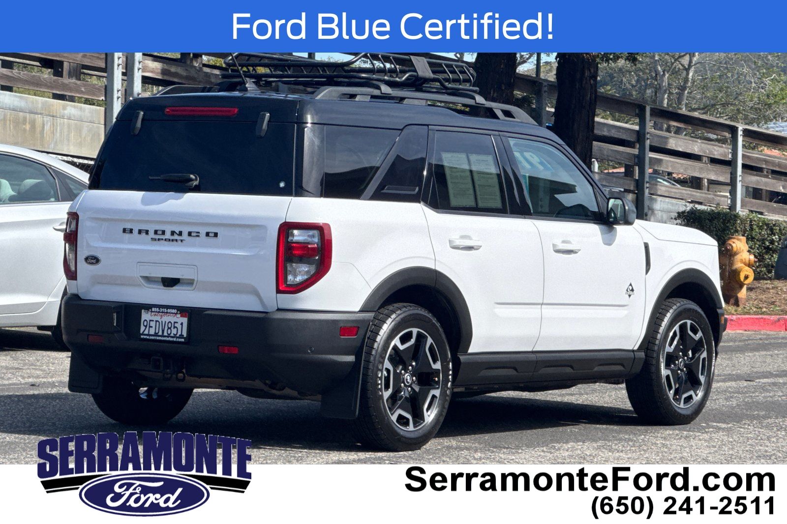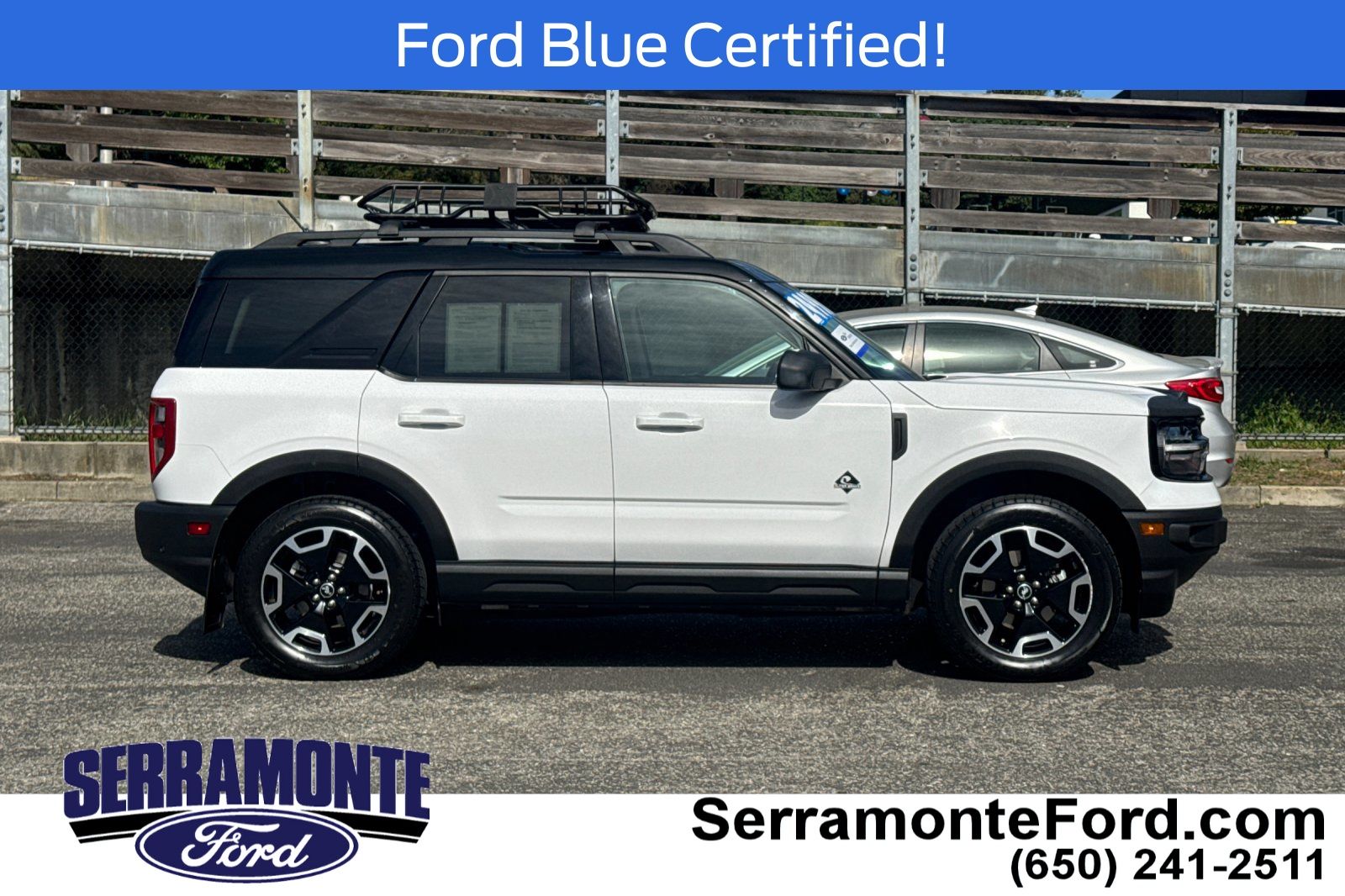 Recent Arrival! Certified. New Price! Bronco Sport Outer Banks, 4WD, Navy Pier w/Leather Trimmed Heated Sport Contour Bucket Seats. Odometer is 3717 miles below market average! 25/28 City/Highway MPG Oxford White 2022 Ford Bronco Sport Outer Banks 4WD 8-Speed Automatic 1.5L EcoBoost. Low, No Haggle prices on all of our Pre-Owned Vehicles. Get a fair price up front without having to negotiate for it. Let us show you how our prices compare! Come see our Brand New Showroom at 999 Serramonte Blvd! We've been here over 40 years but our building is as new as it gets! Proudly serving San Francisco, Daly City, Colma, Redwood City, Pacifica, Half Moon Bay, San Mateo, San Bruno, and entire SF Bay Area.