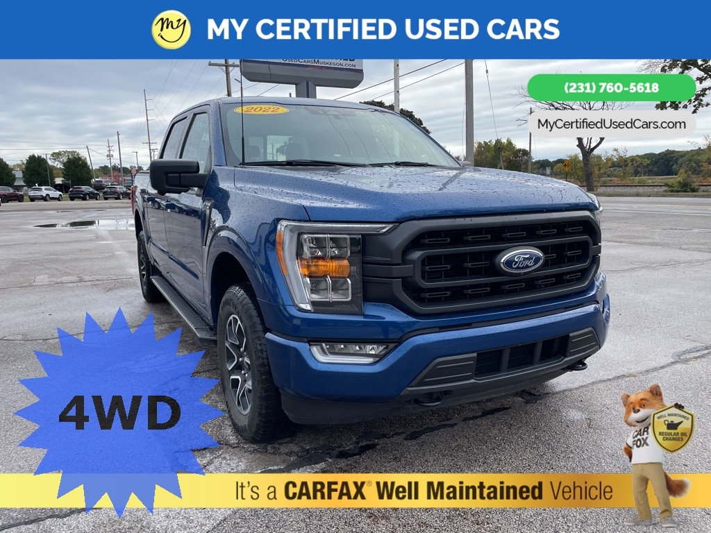 **Super Buy & Loaded with Options**, **2022 Ford F-150 XLT 4x4 4D Super-Crew**. CARFAX One-Owner. Atlas Blue Metallic 2022 Ford F-150 XLT 4WD 10-Speed Automatic 2.7L V6 EcoBoost. Recent Arrival! MY Certified Used Cars is proud to service customers saving you time & money on any pre-owned vehicle! Every vehicle has been through a full safety inspection completed by certified technicians and fully detailed. We sell many makes and models, pre-owned vehicles with years from 2025-2024-2023-2022-2021-2020-2019-2018-2017-2016-2015-2014-2013-2012-2011-2010-2009-2008-2007 and all makes Audi, BMW, Chevrolet, Toyota, Volkswagen, Kia, Hyundai, Mercedes, Dodge, Chrysler, Jeep, Ram, Lincoln, Honda, Subaru, and many models like Bronco, Bronco Sport, Edge, Escapes, Expedition, Explorer, Fusions, Focus, Flex, F-150 Series, F-250, F-350, Super Duty Diesel Trucks, Maverick, Mustang Mach-E, Mustang, Ranger, Transit, Wrangler, Grand Cherokee, Grand Cherokee L, Wagoneer, Gladiator, Grand Caravan, RAM, RAM HEMI, and more. Take advantage of our VIP experience by calling 231-760-5618 to schedule a test drive. Read our customer reviews at www.mycertifiedusedcars.com/testimonials or view our entire selection of preowned vehicles at www.mycertifiedusedcars.com, or stop by today, located at 3692 Airline Rd. Muskegon, MI 49444.
