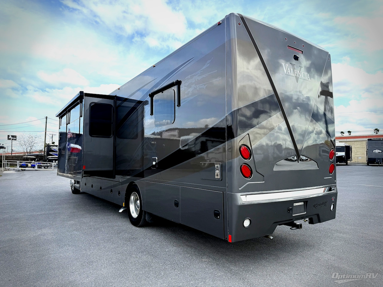 Renegade Valencia Super C diesel motorhome 38RW highlights: Walk-Through Bathroom, Rear Private Bedroom, Bunk Over Cab, Hide-A-Bed Sofa, Girard Awning, Exterior Entertainment. Enjoy a home on wheels with this motorhome! Start your mornings feeling refreshed and ready to go after sleeping on the 72" x 74" king bed and showering in the neo-angled shower with a skylight above and a vent to eliminate steam in the walk-through bathroom. The bedroom also has a 32" TV with a cedar chest, a dresser with overhead cabinets, a large wardrobe, and an area prepped to add an optional washer and dryer. You can prepare your best meals with the three burner cooktop and 19 cu. ft. refrigerator and enjoy them at the booth dinette. The hide-a-bed sofa and 60" x 80" bunk over cab offer comfortable sleeping spaces for extra guests too! Each one of these Renegade Valencia Super C diesel motorhomes offer the ultimate comfort and durable construction! They have the first front engine diesel Freightliner S2RV chassis for a refined ride with responsive handling, as well as a powerful Cummins ISB 360 HP engine with a 3,000MH Alison transmission and a single 100 gallon fuel tank to get you farther. A few of the beautifully designed interior features are the solid hardwood cabinets, the polished solid surface countertops, and the stainless steel appliances. Travel in comfort and style with the modern furniture and abundant storage areas like the exterior powder coated steel storage compartments with carpeted lining. You will also appreciate the four point automatic hydraulic leveling system and the multiplex system with color touch panel and Bluetooth app control. With four full paint color options and three interior décor options, you can be sure to find the right one for you!