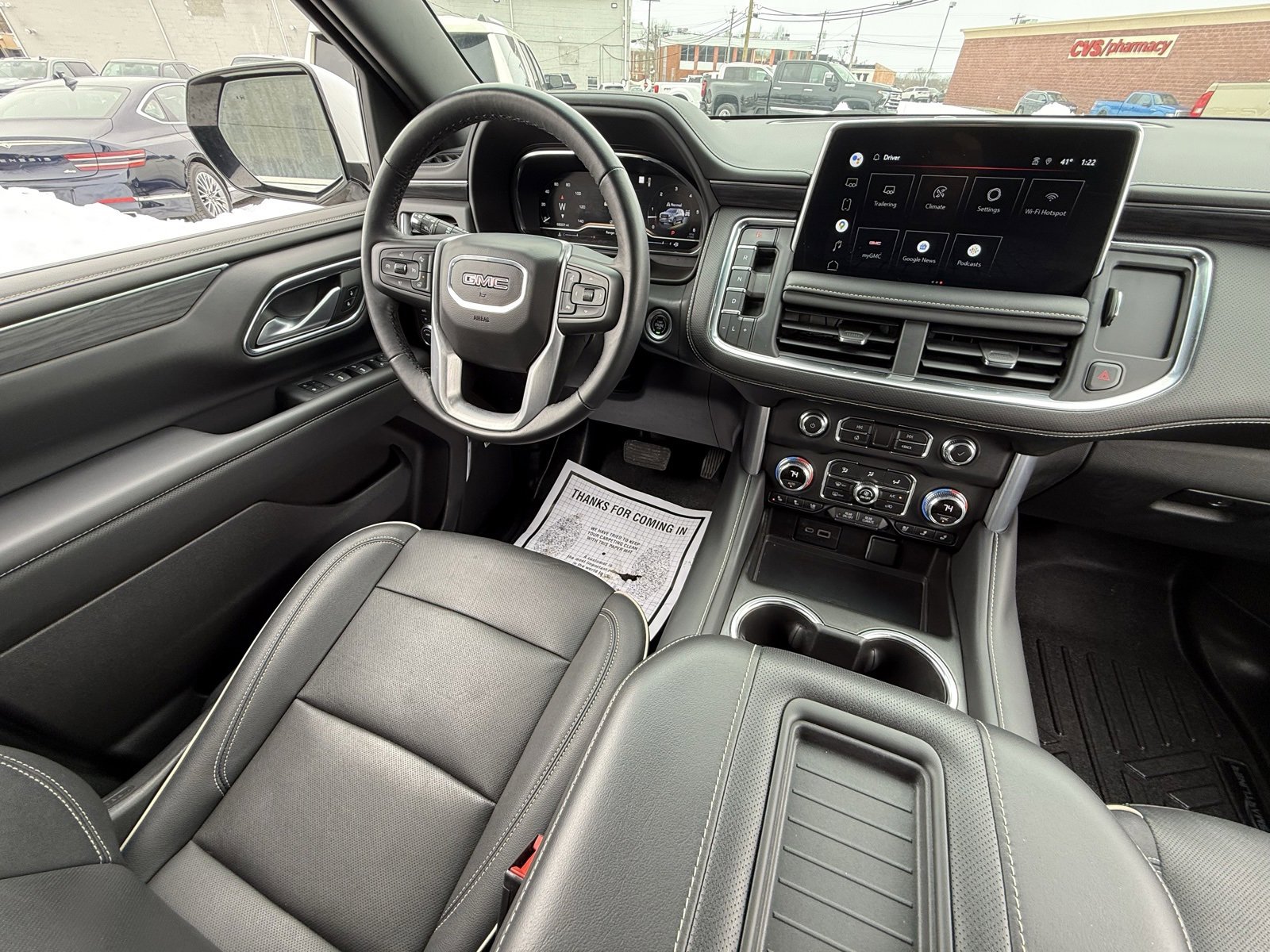 This 2022 GMC Yukon SLT 4SA is finished in Summit White over a Jet Black leather interior. Power comes from a 5.3L EcoTec3 V8 paired with a 10-speed automatic transmission and four-wheel drive, plus an air suspension and an electronic Autotrac 2-speed transfer case. The SLT Luxury Package adds 3rd-row seating, heated rear seats, seat memory, power-folding heated mirrors with integrated turn signals, and an Aerial View Display System. Max Trailering Package equipment brings an integrated trailer brake controller, hitch guidance with Hitch View, extra-capacity cooling, and a tow hitch. Inside, passengers get second-row captain’s chairs, a 3rd-row bench, tri-zone automatic climate control, a premium sound system, and power liftgate with remote trunk release. Safety tech includes front collision warning and mitigation, rear pedestrian alert, child safety locks, trailer sway control via the smart trailer integration indicator, and multiple airbags. Telematics, a universal garage door opener, and a surround-view camera system round out this well-equipped full-size SUV.
