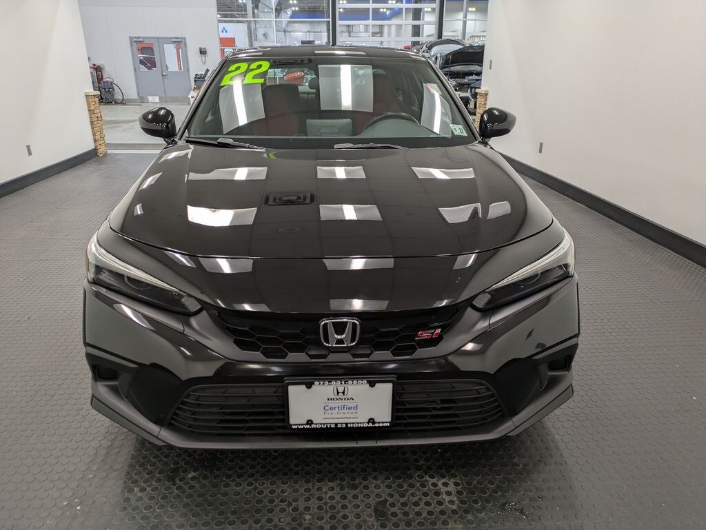 Crystal Black Pearl 2022 Honda Civic Si 6-Speed Manual FWD 1.5L I4 DOHC 16V. Black w/Cloth Seat Trim. Odometer is 12628 miles below market average! CARFAX One-Owner. With purchase or lease of your New, Pre-Owned or Certified Pre-Owned Honda purchased or leased from Route 23 Honda; to be done with dealer recommended services, must be done at Route 23 Honda Service Center only. Not available on prior sales; not available on Diesels, SVTs, Performance or Commercial vehicles.