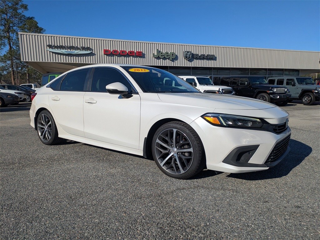 Recent Arrival! Carfax One-Owner. Family Owned and Operated for almost 30 Years come experience a hassle free buying process with 5 star service. Call today 229-686 2068 O'Steen CJDR has been serving the local community for over 4 years! "Pre-Owned with Peace of Mind" Only at O'Steen. 2022 Honda Civic Touring Leather, 12 Speakers, 4-Wheel Disc Brakes, ABS brakes, Adaptive Cruise Control: Adaptive Cruise Control (ACC) with Low-Speed Follow, Air Conditioning, Alloy wheels, AM/FM radio: SiriusXM, Apple CarPlay/Android Auto, Auto High-beam Headlights, Auto-dimming Rear-View mirror, Automatic temperature control, Blind Spot Information (BSI) System warning, Brake assist, Bumpers: body-color, Compass, Delay-off headlights, Driver door bin, Driver vanity mirror, Dual front impact airbags, Dual front side impact airbags, Electronic Stability Control, Emergency communication system: HondaLink, Exterior Parking Camera Rear, Four wheel independent suspension, Front anti-roll bar, Front Bucket Seats, Front Center Armrest, Front dual zone A/C, Front fog lights, Front reading lights, Fully automatic headlights, Garage door transmitter: HomeLink, Heated door mirrors, Heated Front Bucket Seats, Heated front seats, Illuminated entry, Knee airbag, Leather Seat Trim, Leather Shift Knob, Leather steering wheel, Low tire pressure warning, Navigation system: Honda Satellite-Linked Navigation System, Occupant sensing airbag, Outside temperature display, Overhead airbag, Overhead console, Panic alarm, Passenger door bin, Passenger vanity mirror, Power door mirrors, Power driver seat, Power moonroof, Power passenger seat, Power steering, Power windows, Radio data system, Radio: Bose Premium w/AM/FM/HD/SiriusXM Sound System, Rain sensing wipers, Rear anti-roll bar, Rear seat center armrest, Rear side impact airbag, Rear window defroster, Remote keyless entry, Security system, Speed control, Speed-sensing steering, Split folding rear seat, Steering wheel mounted audio controls, Tachometer, Telescoping steering wheel, Tilt steering wheel, Traction control, Trip computer, Turn signal indicator mirrors, Variably intermittent wipers, Wheels: 18" Alloy w/Gloss Shark Gray Inserts. "Pre-Owned with Peace of Mind" Only at O'Steen., Leather. CALL NOW!! This vehicle will not make it to the weekend!!