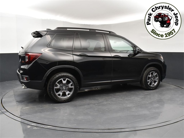 Start driving our Accident Free, One Owner 2022 Honda Passport TrailSport AWD, and step up to bolder adventures in Crystal Black Pearl! Motivated by a 3.5 Liter V6 delivering 280hp tethered to a 9 Speed Automatic transmission for performance with a purpose. This All Wheel Drive SUV also features dedicated sand, snow, and mud modes for its traction management system, and it returns nearly 24mpg on the highway. Trail-friendly design touches for our Passport include LED lighting, a power sunroof, fog lamps, multifunction mirrors, a power liftgate, and bold alloy wheels. Our TrailSport cabin takes care of you on the road or off with heated leather front seats with orange stitching, 10-way power for the driver, a leather-wrapped steering wheel, tri-zone automatic climate control, keyless access/ignition, and walk-away auto-lock. Confidently explore your world, knowing you can connect on the go with an 8-inch touchscreen, Android Auto/Apple CarPlay, Bluetooth, wireless charging, and a seven-speaker sound system. Clever cargo solutions add even more versatility to this impressive SUV! Honda has your back as you move through your day with a multi-angle rearview camera, a blind-spot monitor, and Sensing technologies like automatic emergency braking, adaptive cruise control, lane-keeping assistance, and more. Our Passport TrailSport is your ticket to having more fun! Save this Page and Call for Availability. We Know You Will Enjoy Your Park Chrysler Jeep Used Test Drive Towards Ownership!